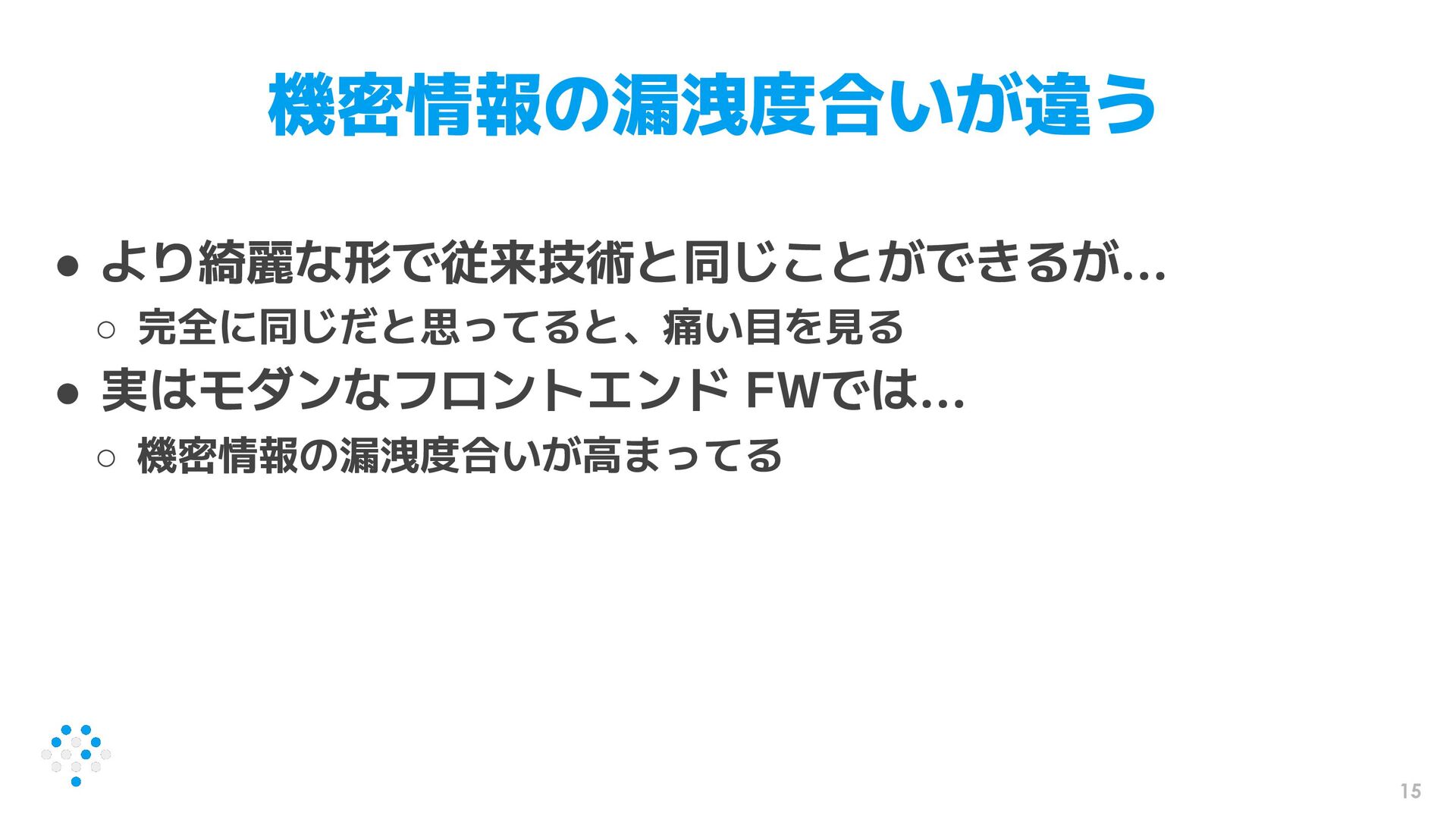 15 機密情報の漏洩度合いが違う • より綺麗な形で従来技術と同じことができるが... ◦ 完全に同じだと思ってると、痛い目を見る • 実はモダンなフロントエンド FWでは... ◦