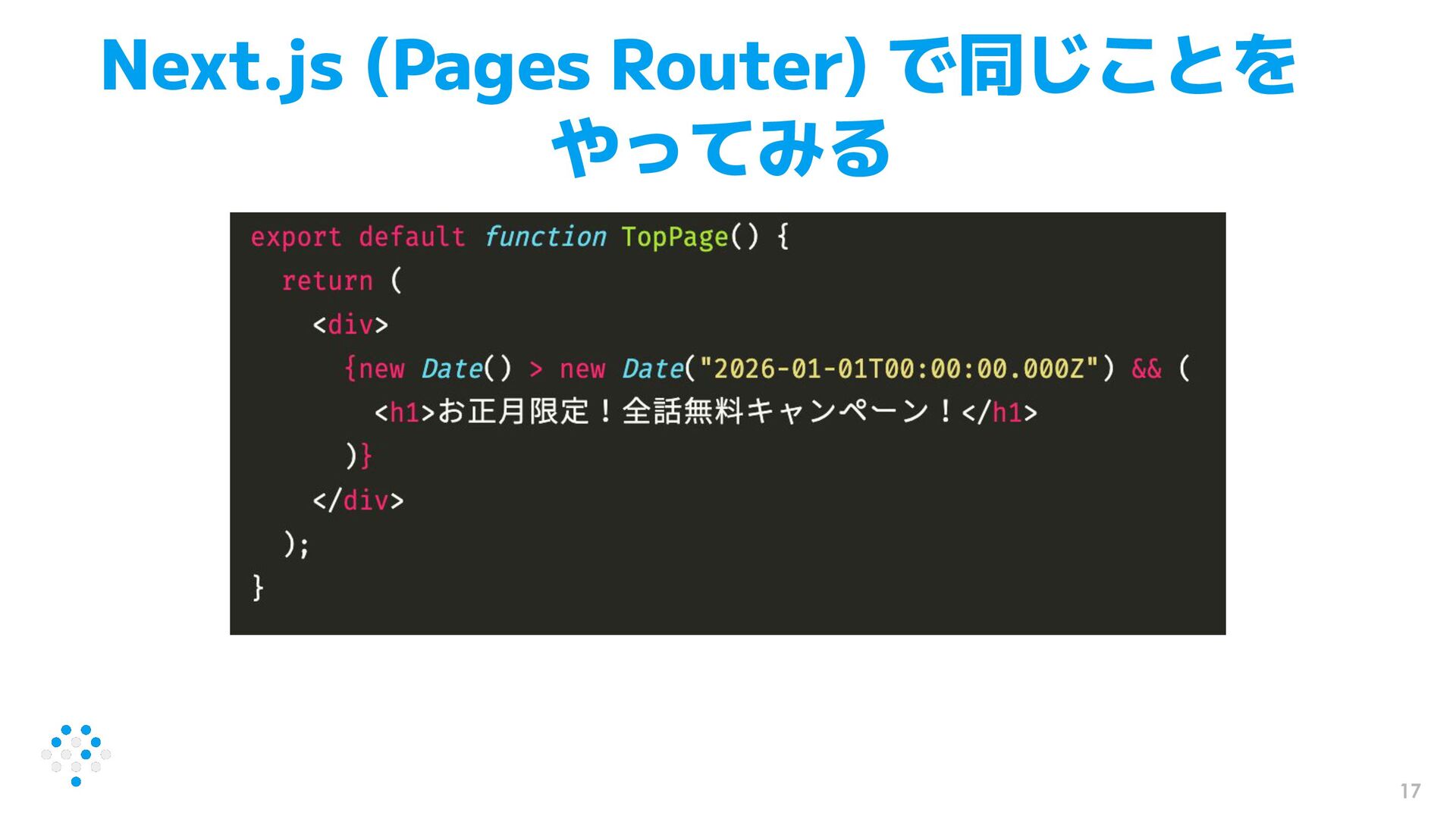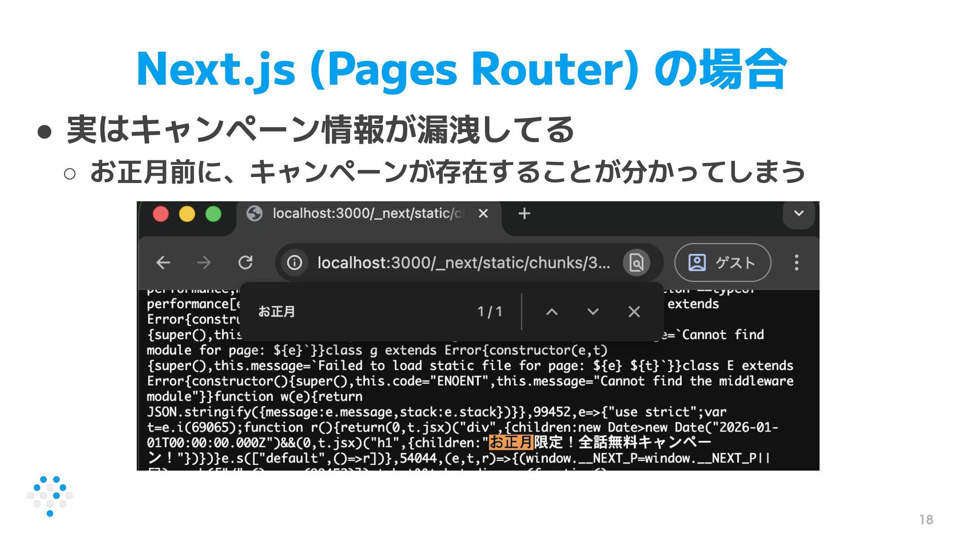 18 Next.js (Pages Router) の場合 • 実はキャンペーン情報が漏洩してる ◦ お正月前に、キャンペーンが存在することが分かってしまう
