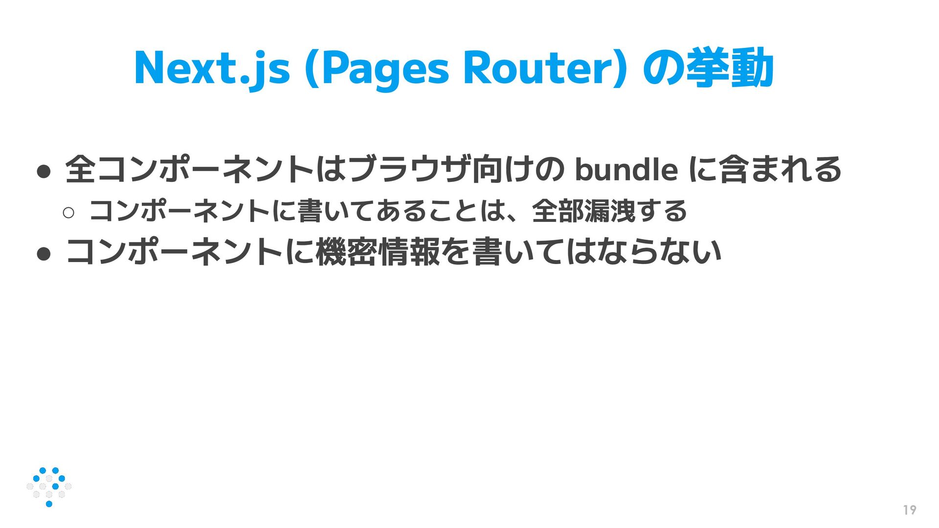 19 Next.js (Pages Router) の挙動 • 全コンポーネントはブラウザ向けの bundle に含まれる ◦
