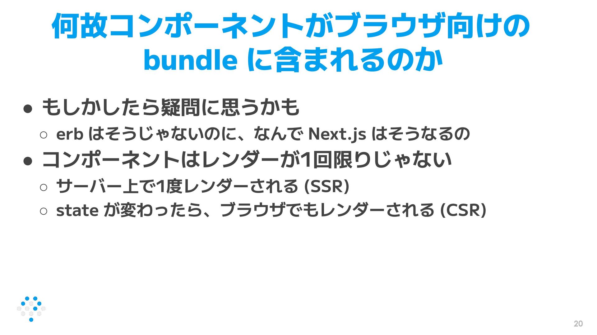 20 何故コンポーネントがブラウザ向けの bundle に含まれるのか • もしかしたら疑問に思うかも ◦ erb はそうじゃないのに、なんで Next.js