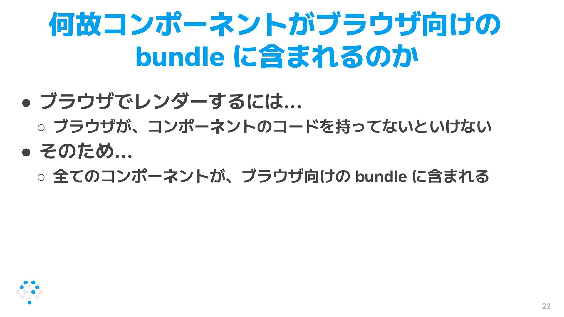 22 何故コンポーネントがブラウザ向けの bundle に含まれるのか • ブラウザでレンダーするには... ◦ ブラウザが、コンポーネントのコードを持ってないといけない • そのため...