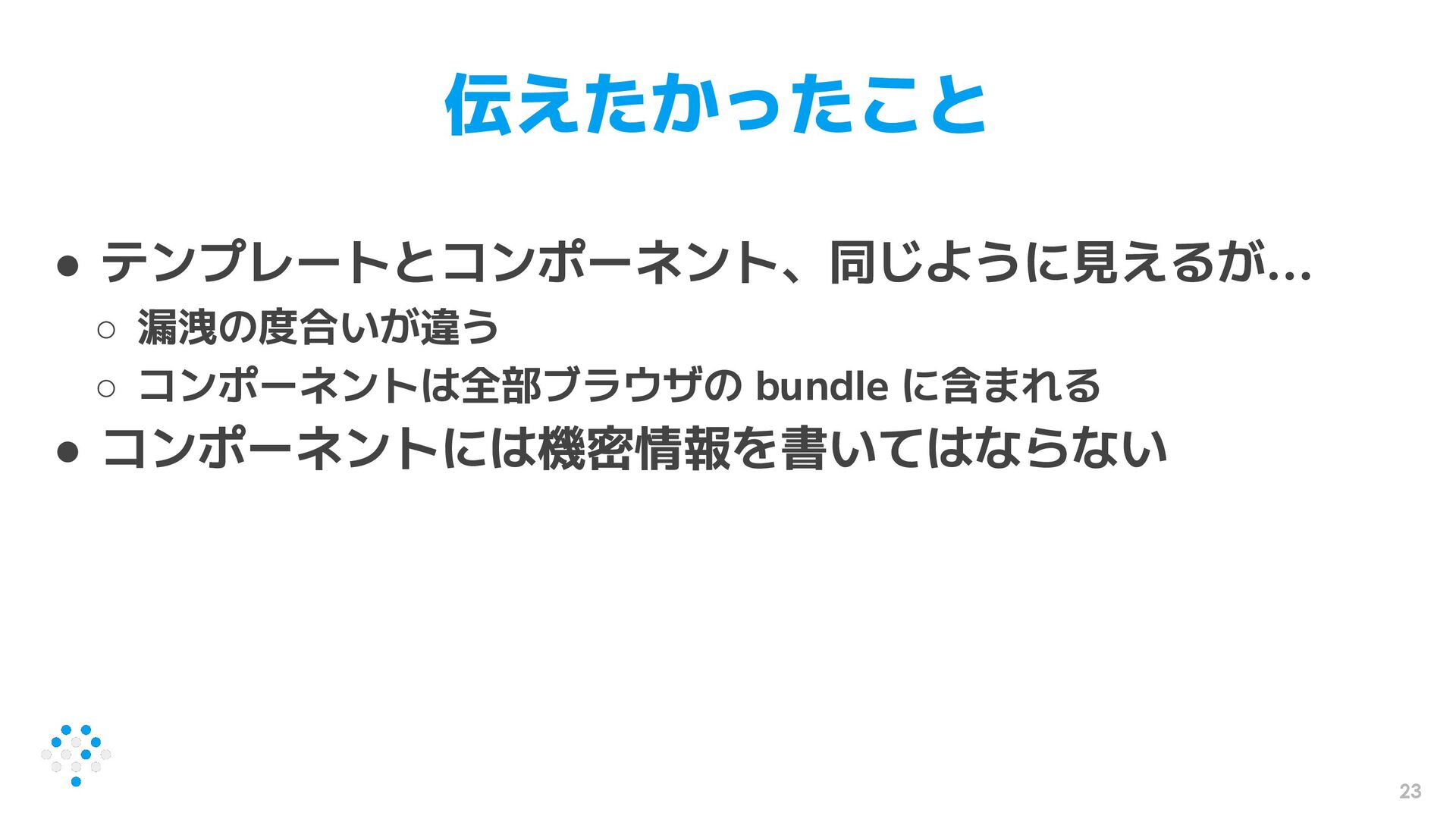 23 伝えたかったこと • テンプレートとコンポーネント、同じように見えるが... ◦ 漏洩の度合いが違う ◦ コンポーネントは全部ブラウザの bundle に含まれる