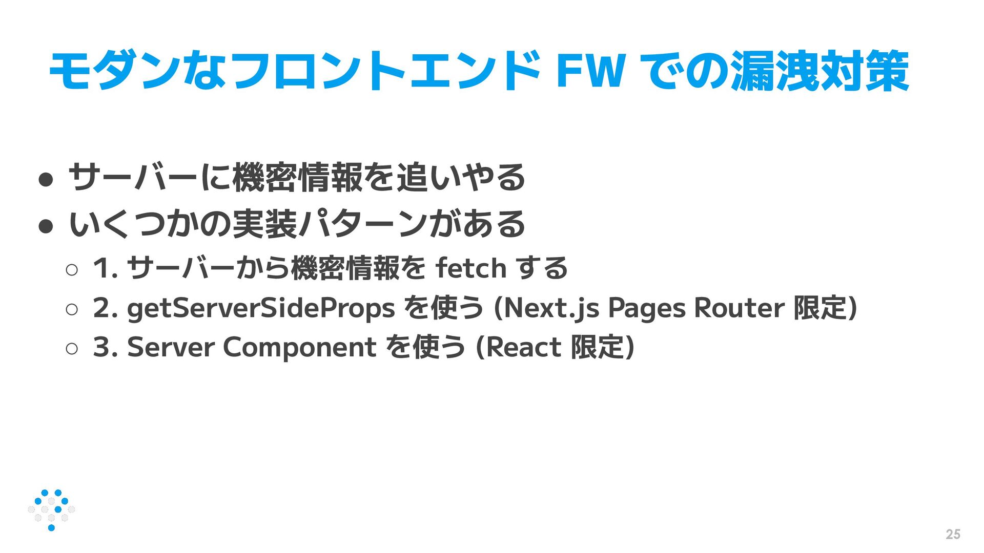 25 モダンなフロントエンド FW での漏洩対策 • サーバーに機密情報を追いやる • いくつかの実装パターンがある ◦ 1.