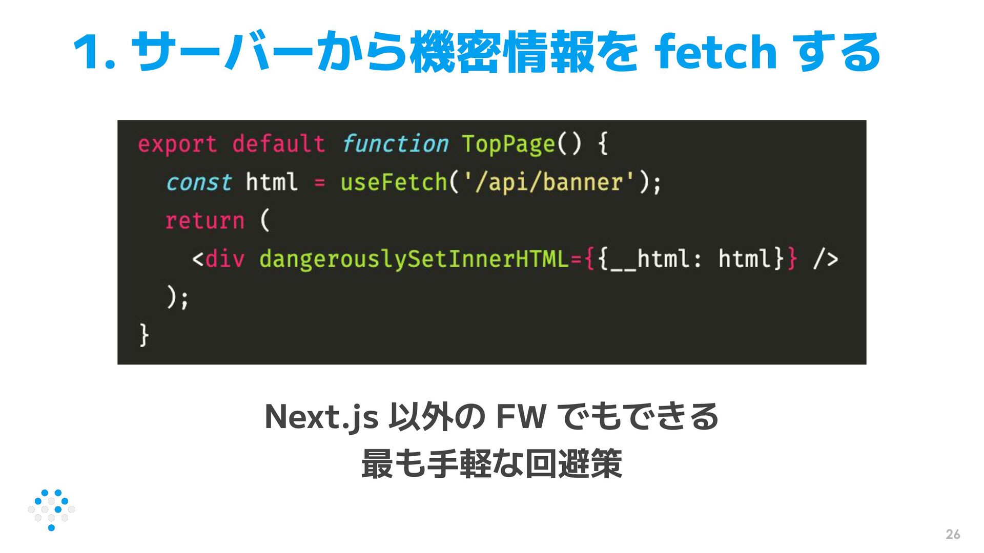 26 1. サーバーから機密情報を fetch する Next.js 以外の FW でもできる 最も手軽な回避策