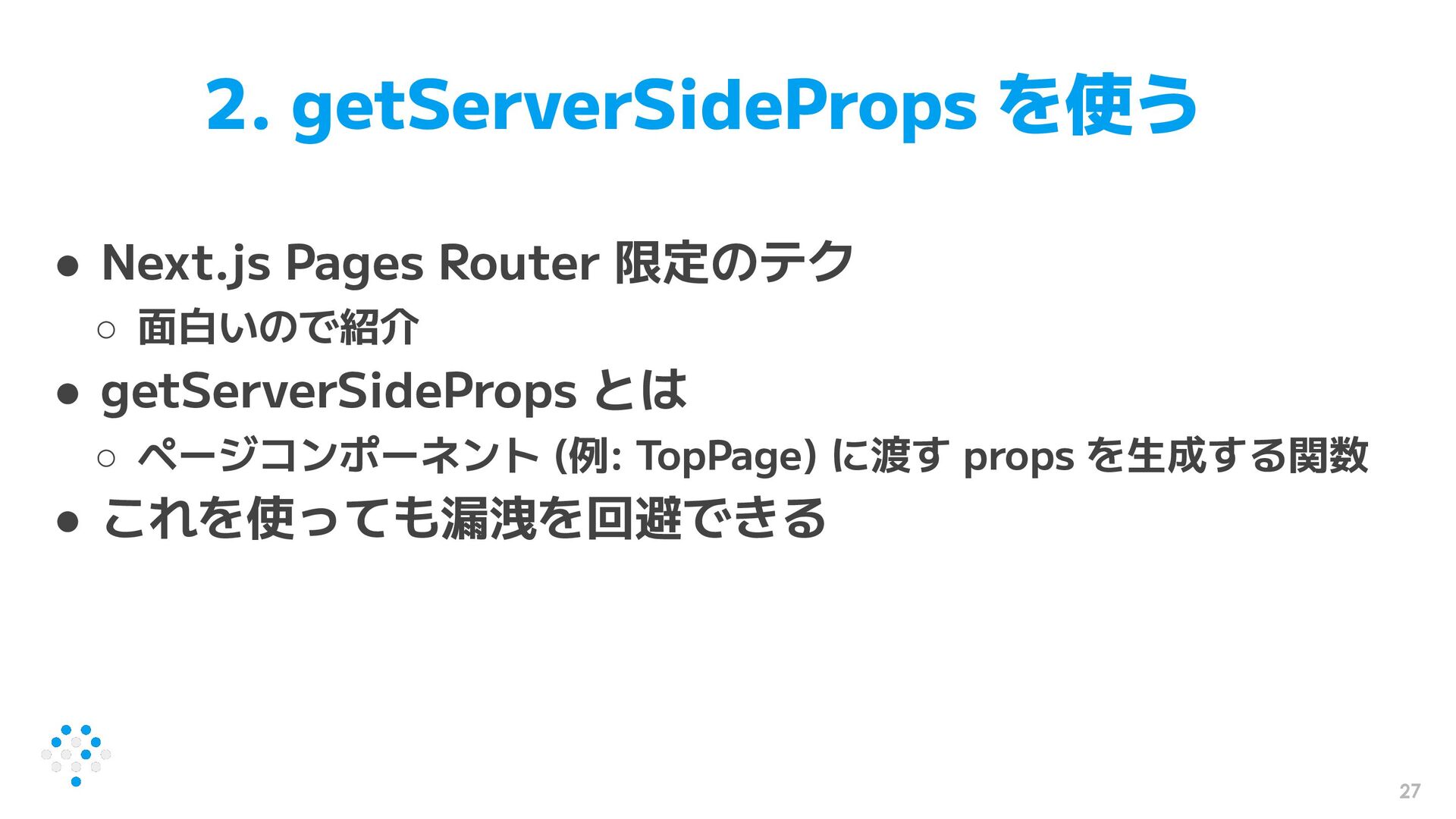 27 2. getServerSideProps を使う • Next.js Pages Router 限定のテク ◦