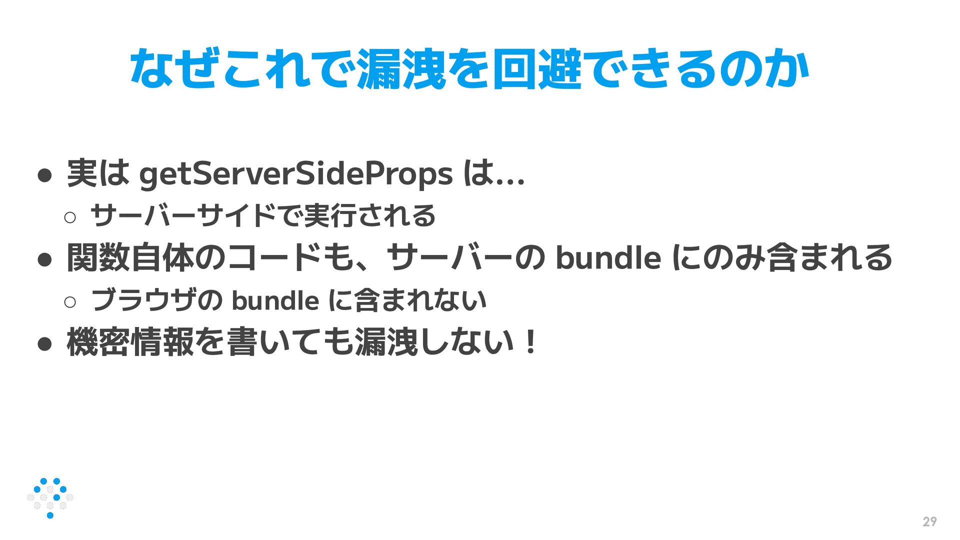 29 なぜこれで漏洩を回避できるのか • 実は getServerSideProps は... ◦ サーバーサイドで実行される • 関数自体のコードも、サーバーの
