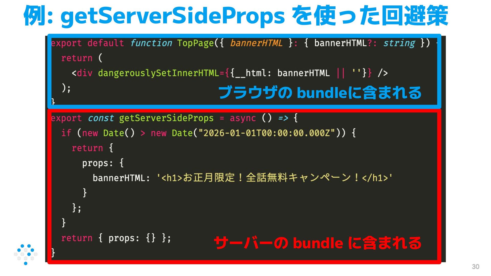 30 例: getServerSideProps を使った回避策 サーバーの bundle に含まれる ブラウザの bundleに含まれる
