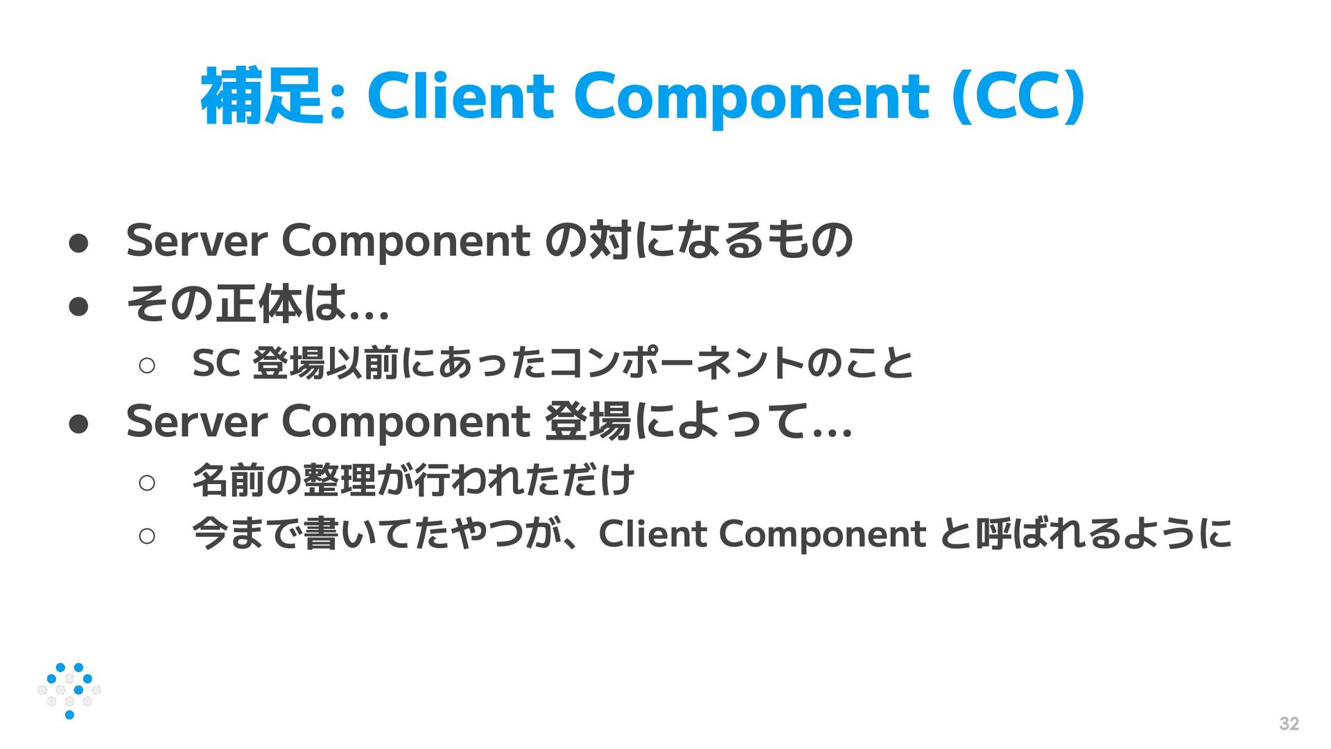 ◦ SC 登場以前にあったコンポーネントのこと • Server Component 登場によって... ◦ 名前の整理が行われただけ ◦ 今まで書いてたやつが、Client Component と呼ばれるように 32