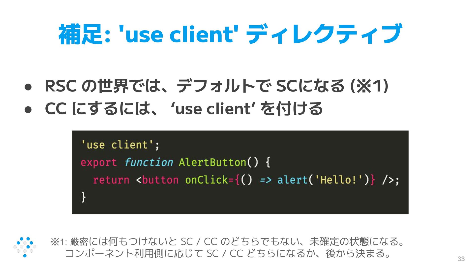 CC にするには、 ‘use client’ を付ける 33 ※1: 厳密には何もつけないと SC / CC のどちらでもない、未確定の状態になる。 コンポーネント利用側に応じて SC / CC どちらになるか、後から決まる。