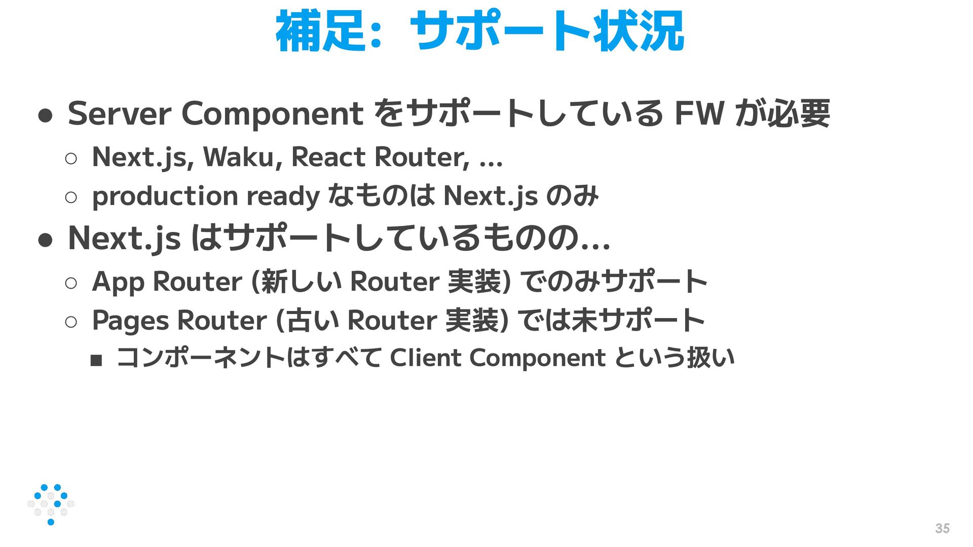 Next.js, Waku, React Router, … ◦ production ready なものは Next.js のみ • Next.js はサポートしているものの... ◦ App Router (新しい Router 実装) でのみサポート ◦ Pages Router (古い Router 実装) では未サポート ▪ コンポーネントはすべて Client Component という扱い
