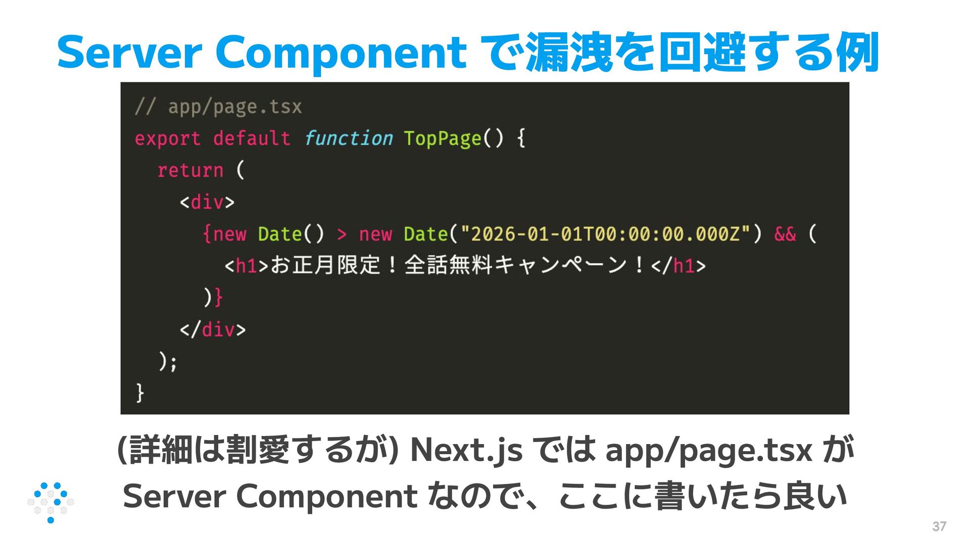 37 Server Component で漏洩を回避する例 (詳細は割愛するが) Next.js では app/page.tsx が Server