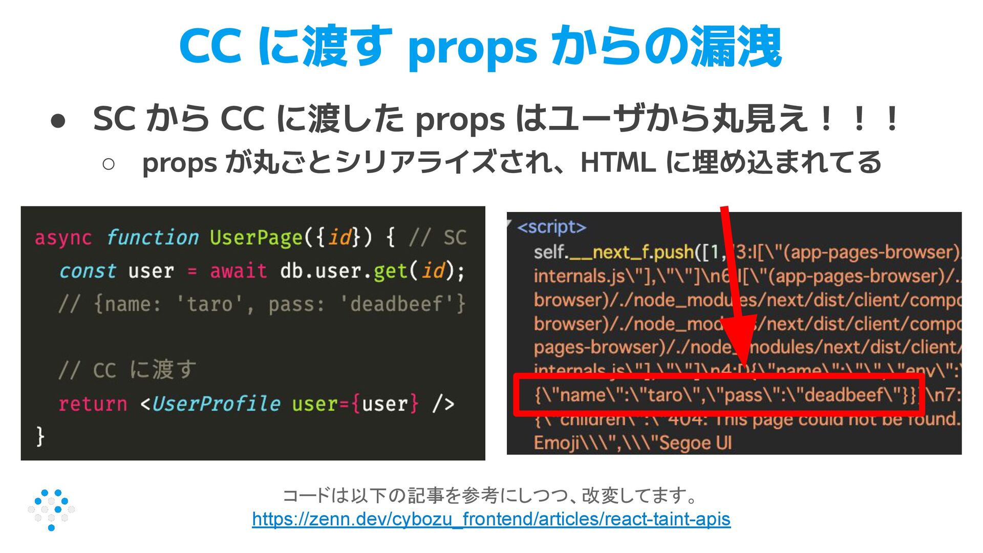 はユーザから丸見え!!! ◦ props が丸ごとシリアライズされ、HTML に埋め込まれてる コードは以下の記事を参考にしつつ、改変してます。 https://zenn.dev/cybozu_frontend/articles/react-taint-apis