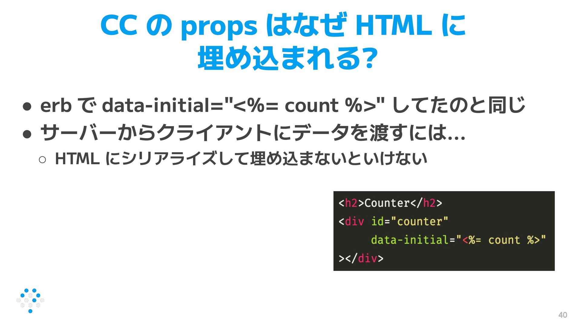 40 CC の props はなぜ HTML に 埋め込まれる? • erb