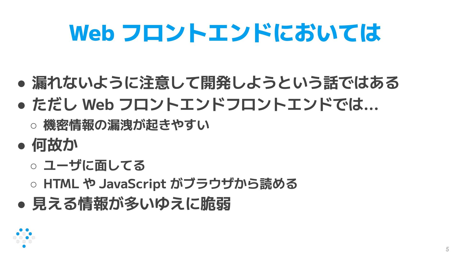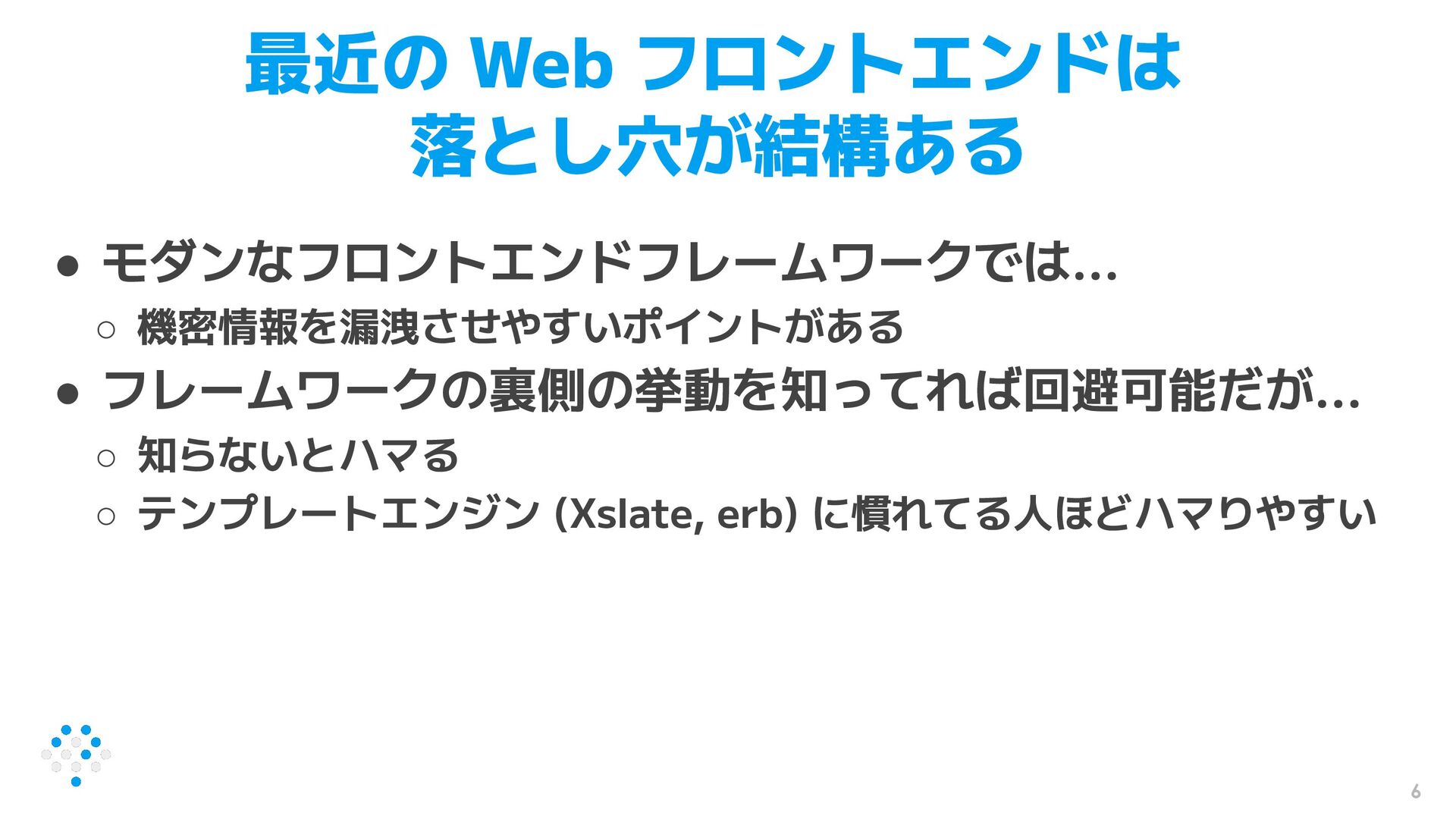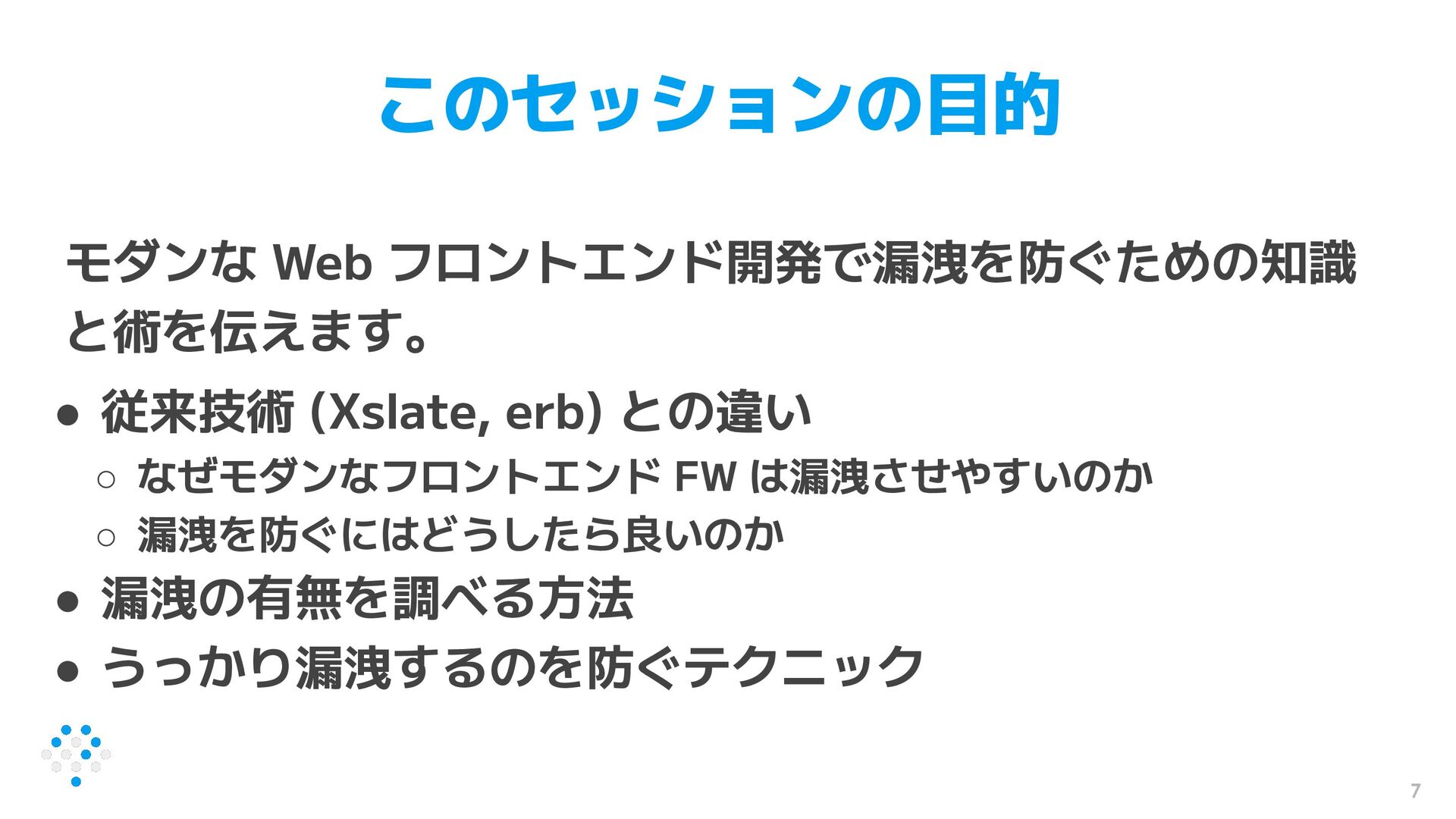 との違い ◦ なぜモダンなフロントエンド FW は漏洩させやすいのか ◦ 漏洩を防ぐにはどうしたら良いのか • 漏洩の有無を調べる方法 • うっかり漏洩するのを防ぐテクニック