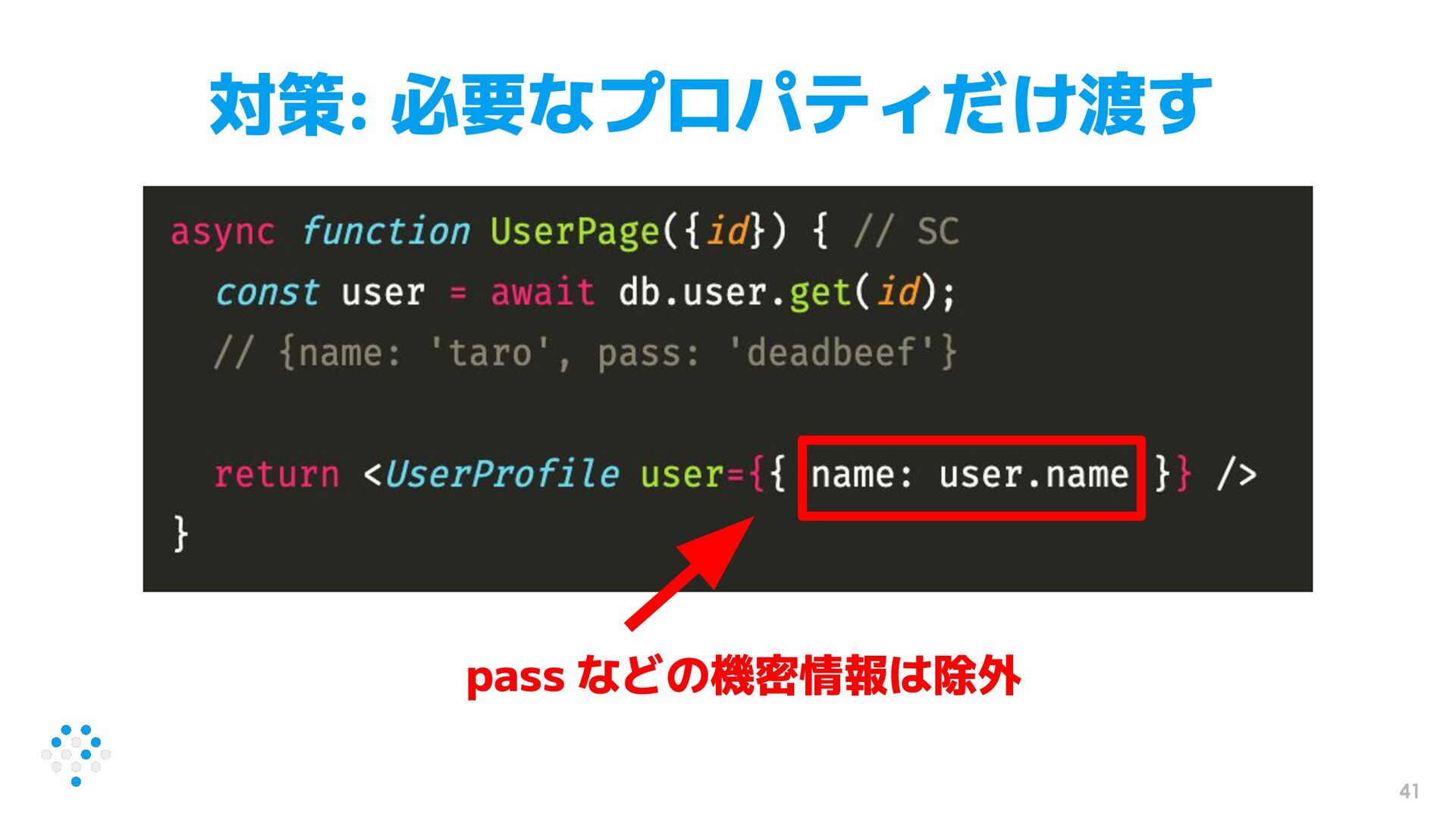 41 対策: 必要なプロパティだけ渡す pass などの機密情報は除外