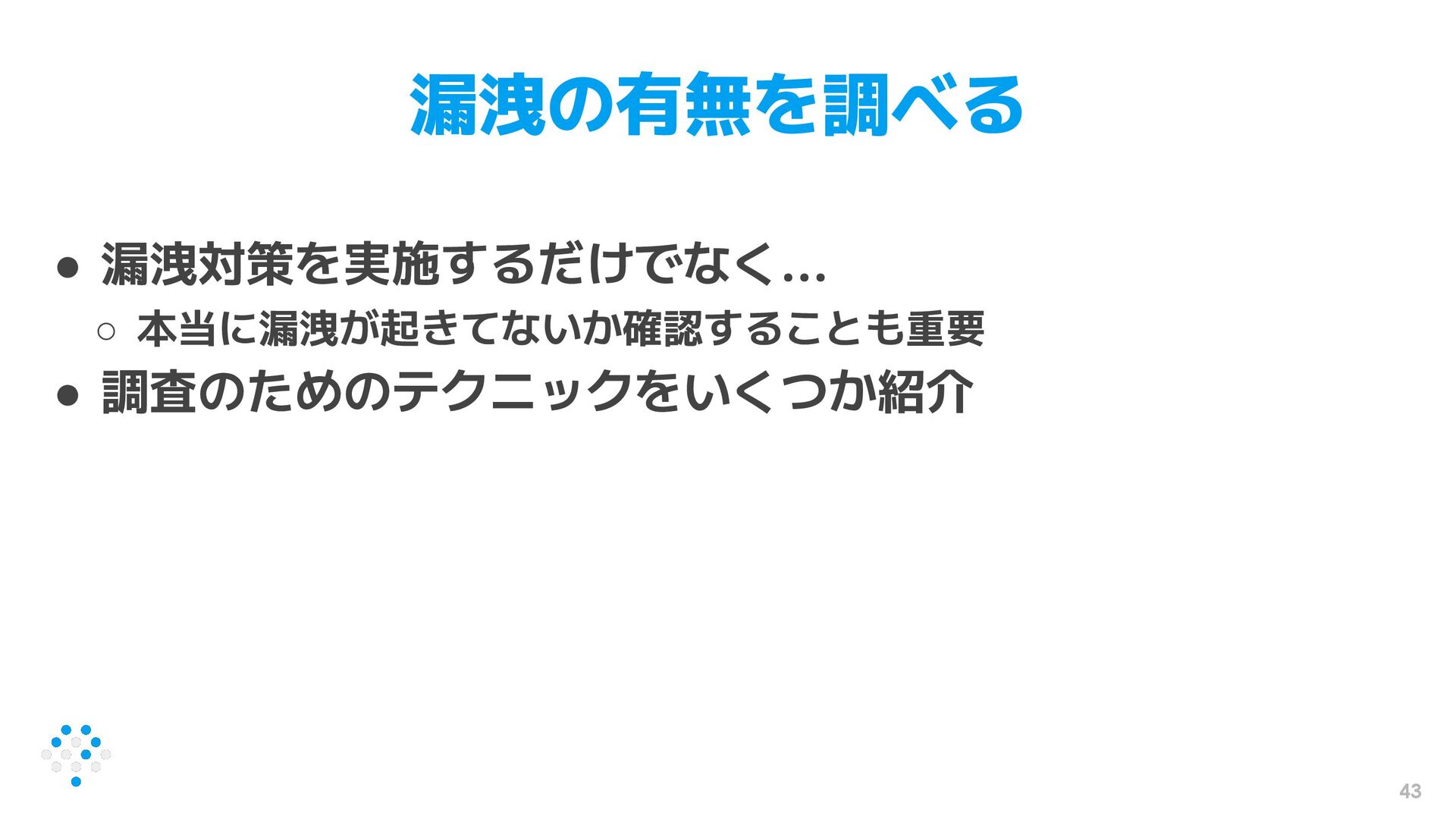 43 漏洩の有無を調べる • 漏洩対策を実施するだけでなく... ◦ 本当に漏洩が起きてないか確認することも重要 • 調査のためのテクニックをいくつか紹介