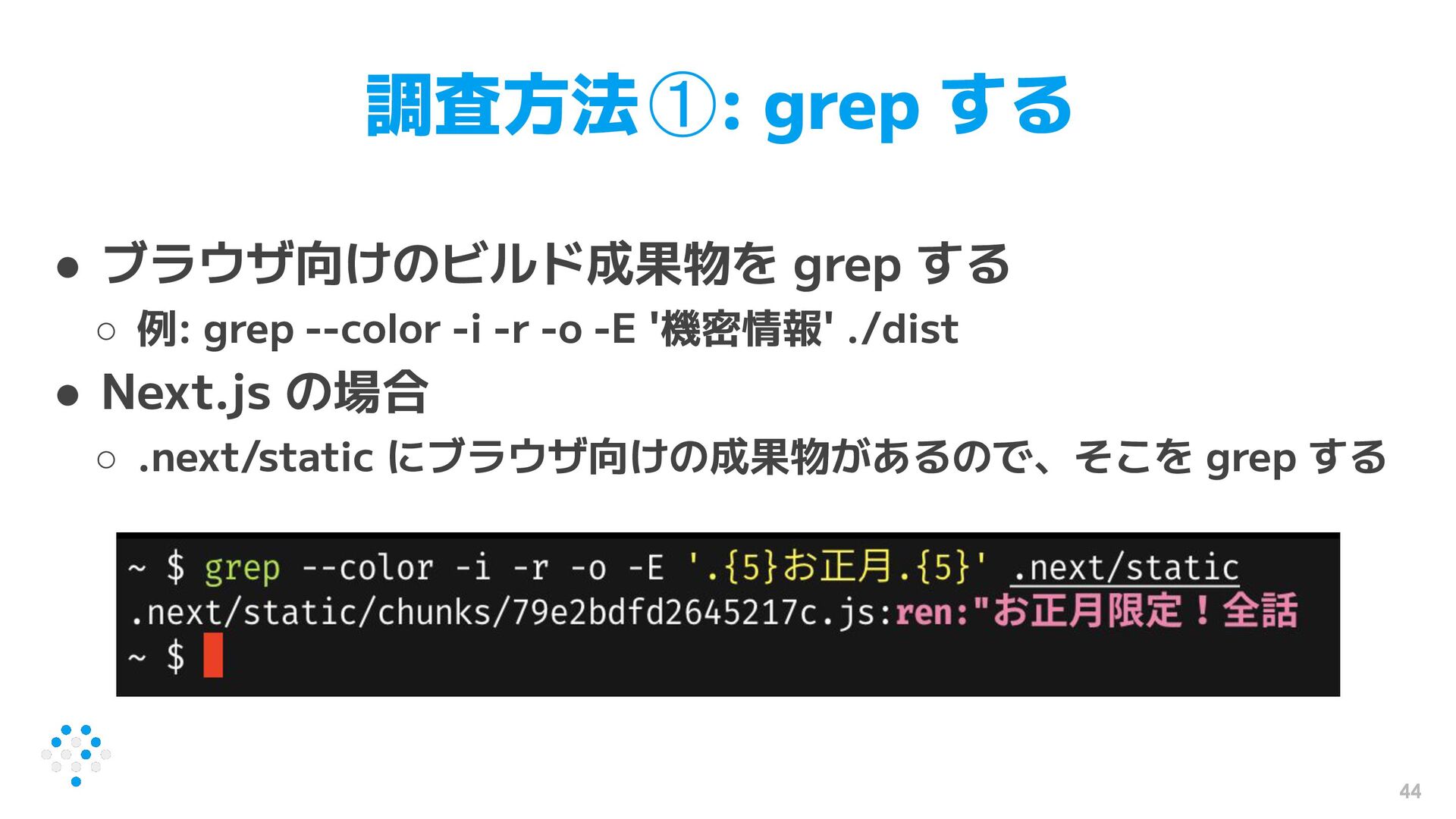 grep --color -i -r -o -E '機密情報' ./dist • Next.js の場合 ◦ .next/static にブラウザ向けの成果物があるので、そこを grep する