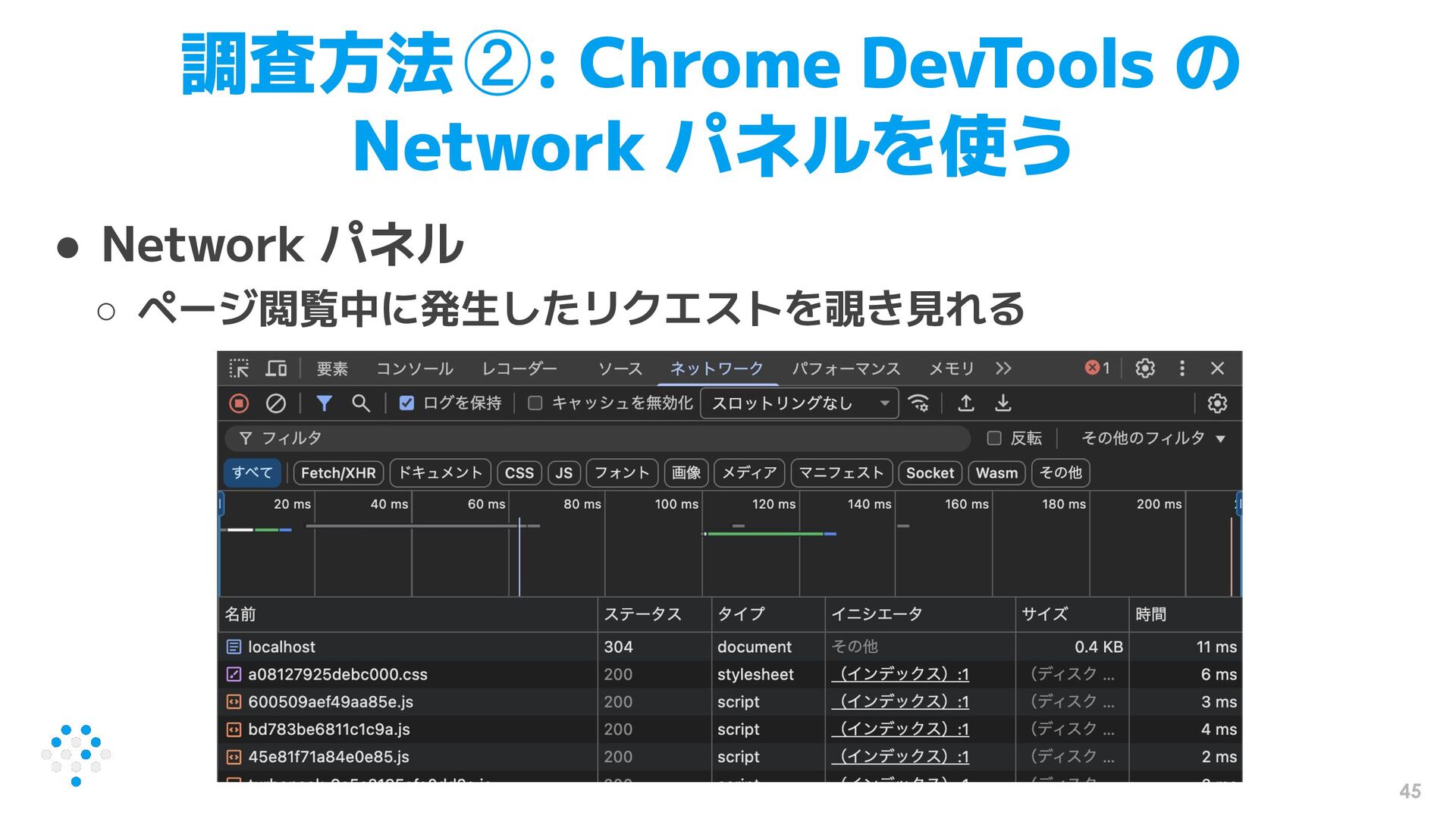 45 調査方法②: Chrome DevTools の Network パネルを使う • Network パネル