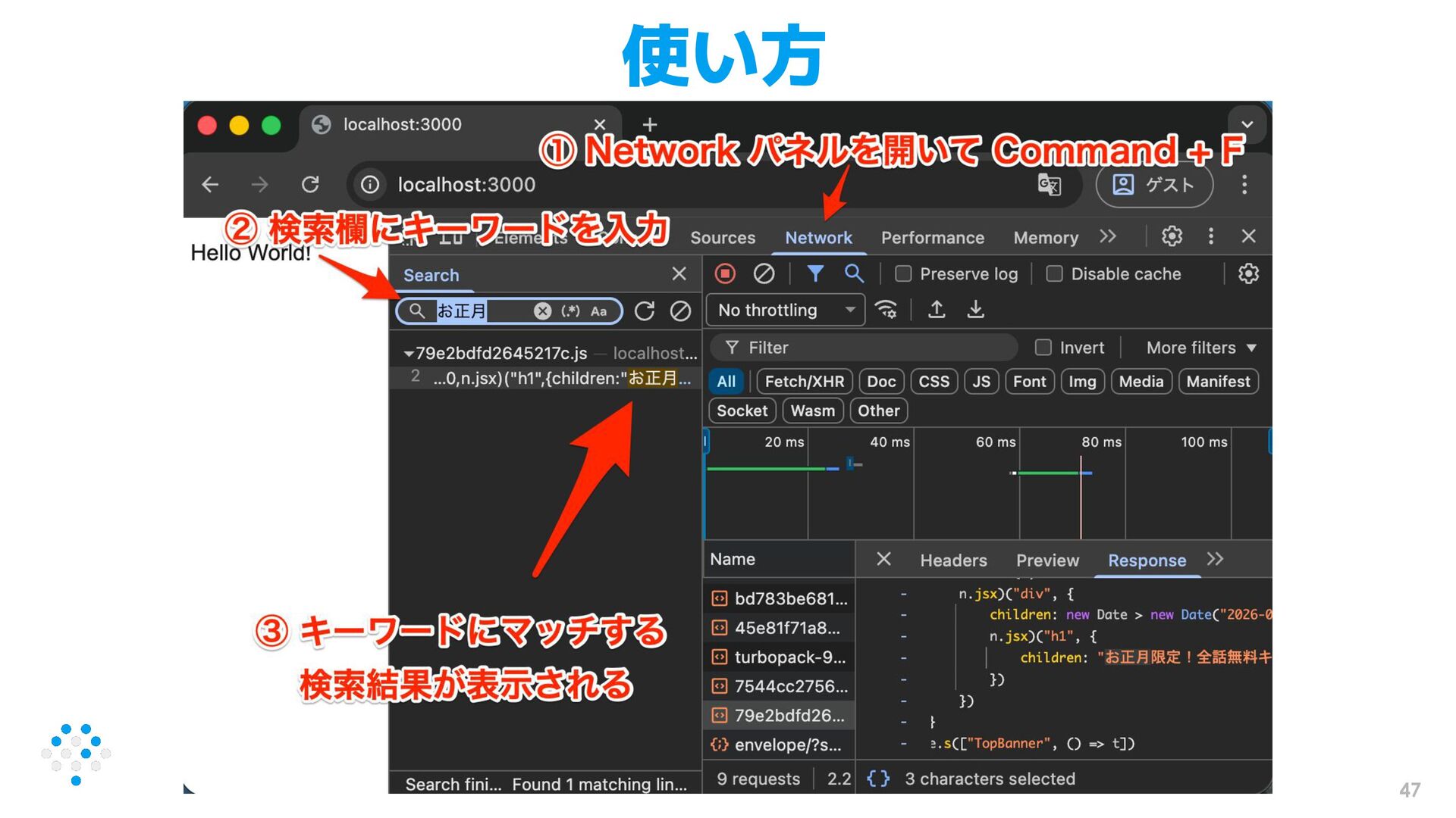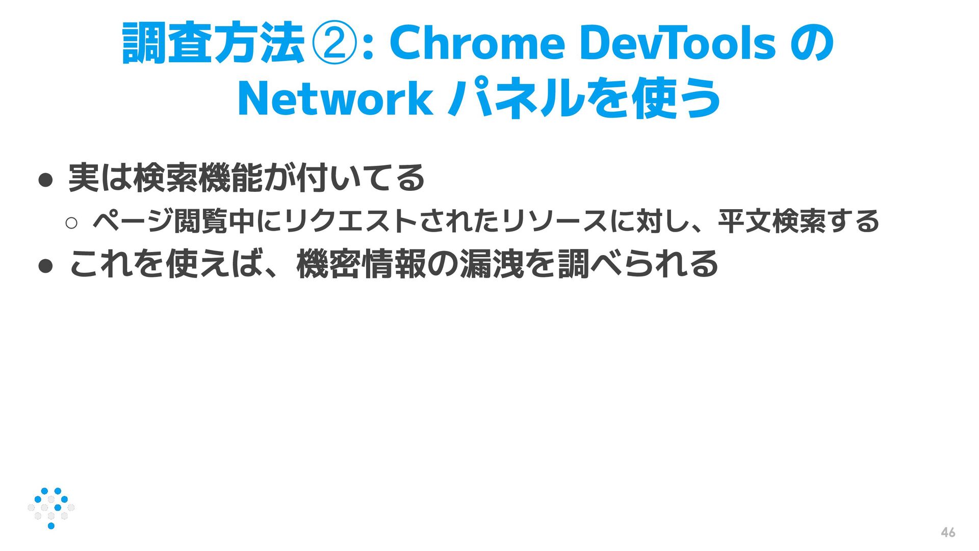 46 調査方法②: Chrome DevTools の Network パネルを使う • 実は検索機能が付いてる ◦