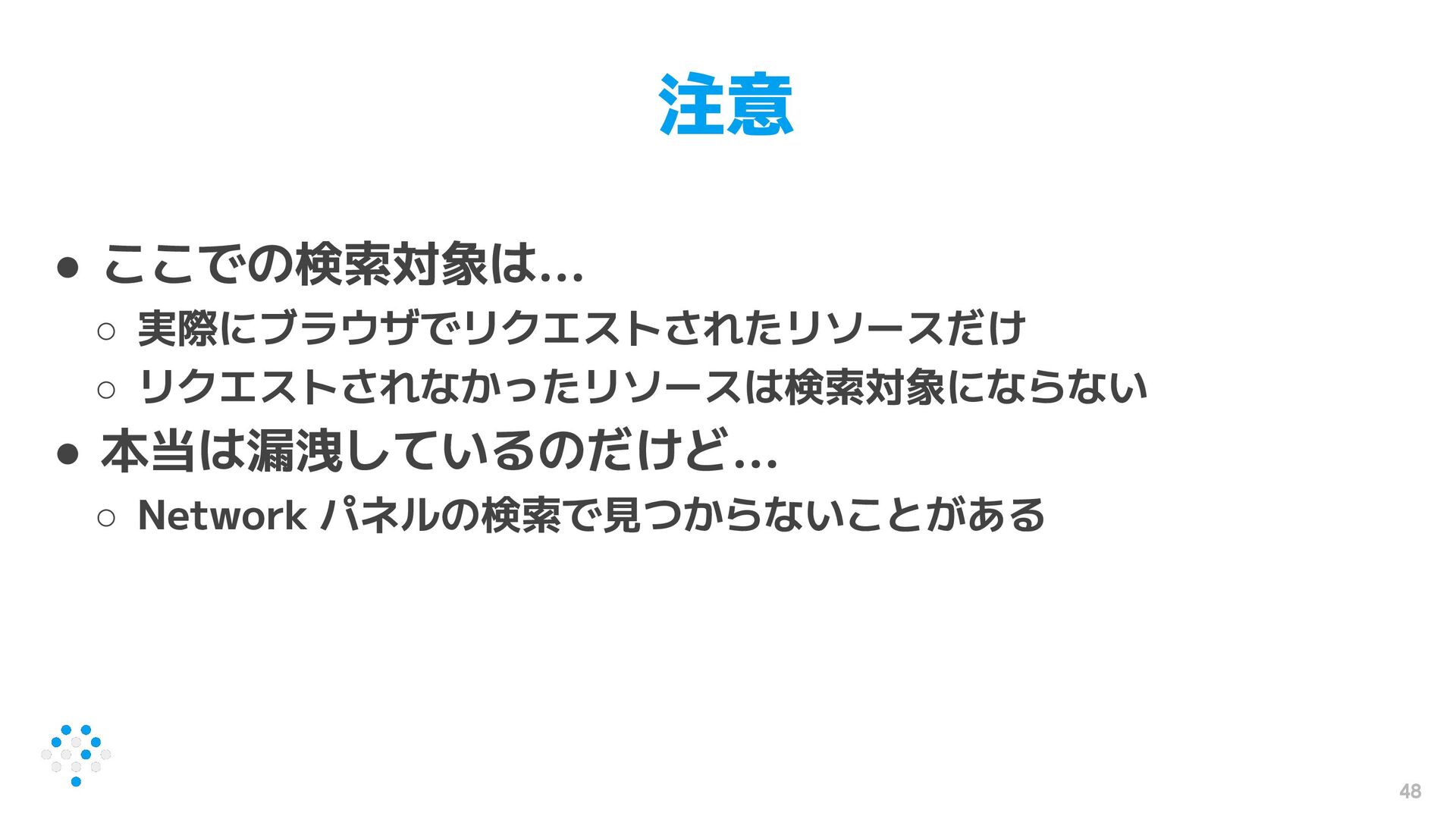 48 注意 • ここでの検索対象は... ◦ 実際にブラウザでリクエストされたリソースだけ ◦ リクエストされなかったリソースは検索対象にならない • 本当は漏洩しているのだけど...