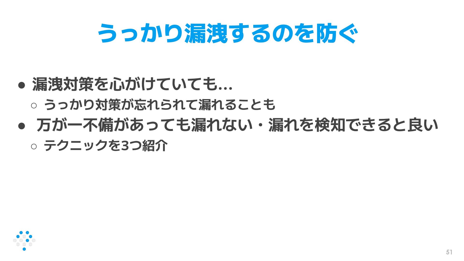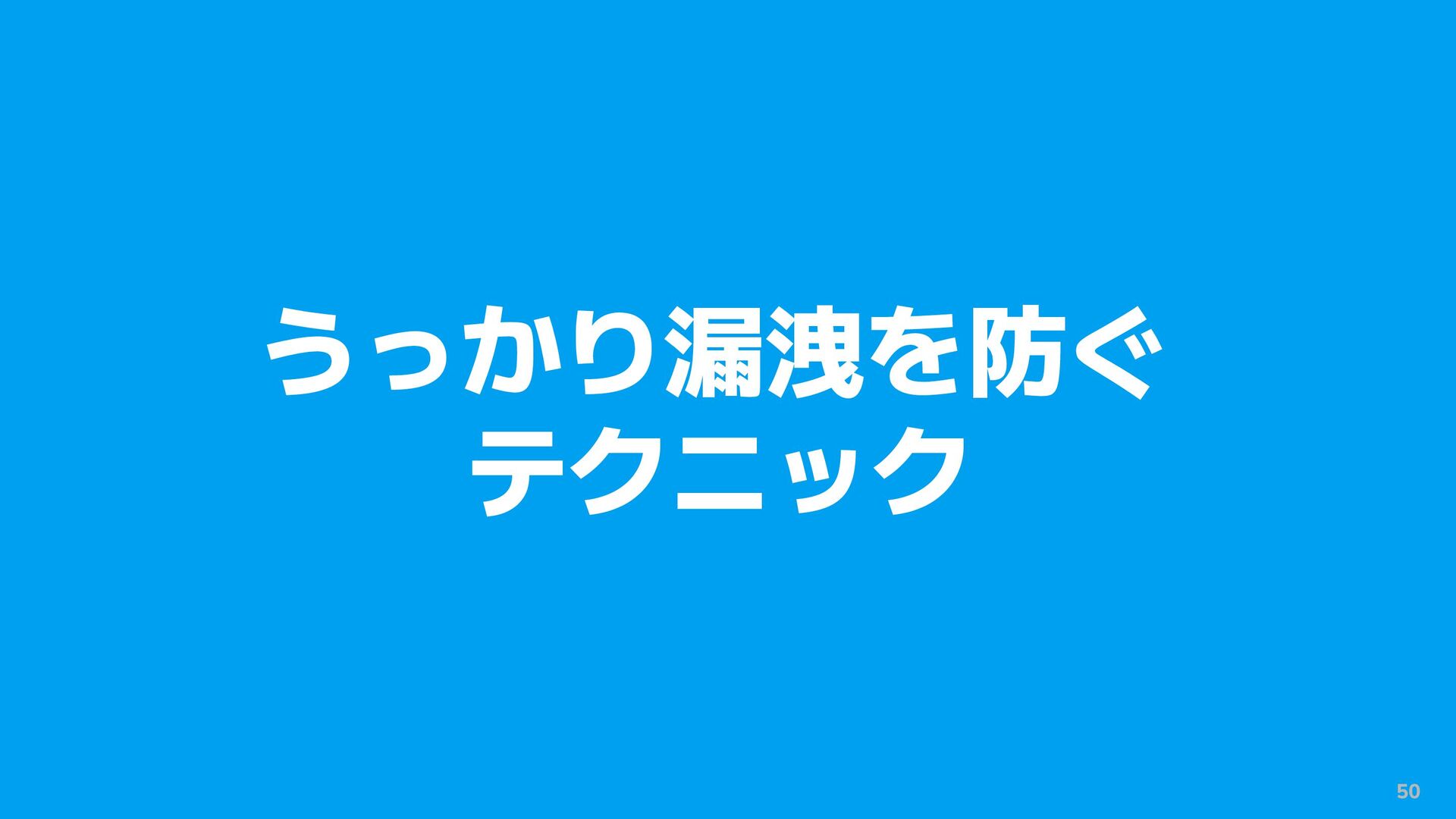 51 うっかり漏洩するのを防ぐ • 漏洩対策を心がけていても... ◦ うっかり対策が忘れられて漏れることも • 万が一不備があっても漏れない・漏れを検知できると良い ◦ テクニックを3つ紹介