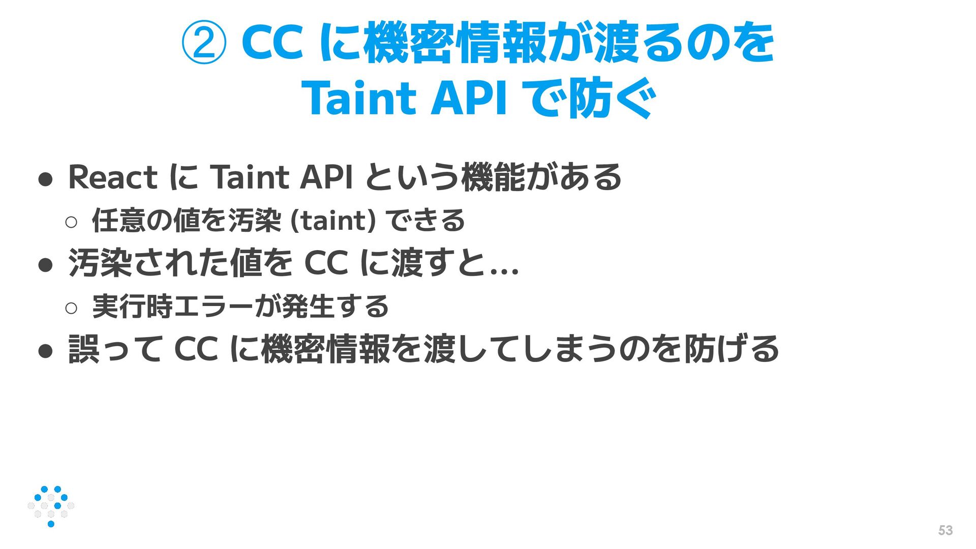 53 ② CC に機密情報が渡るのを Taint API で防ぐ • React に