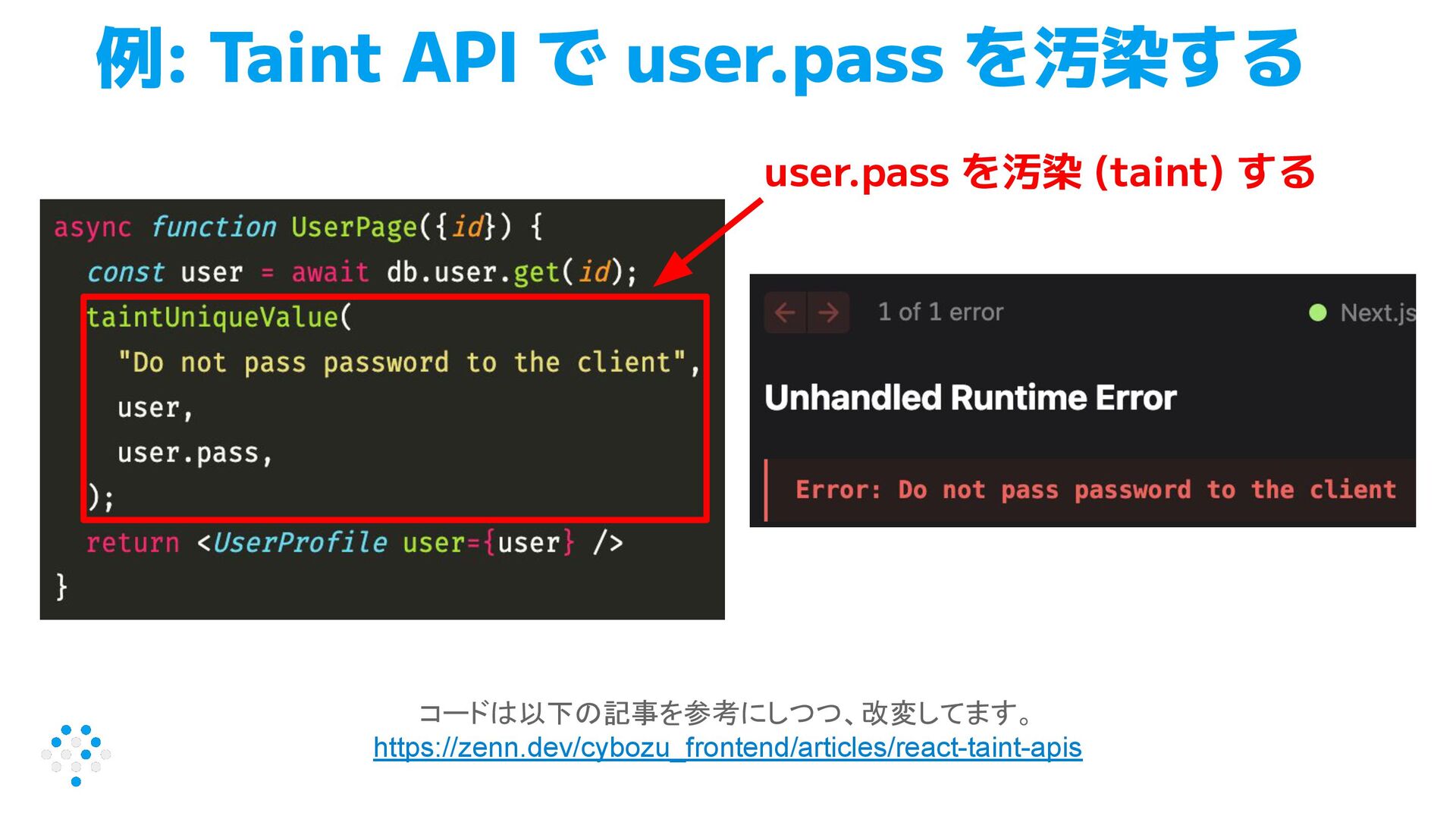 例: Taint API で user.pass を汚染する コードは以下の記事を参考にしつつ、改変してます。 https://zenn.dev/cybozu_frontend/articles/react-taint-apis user.pass を汚染