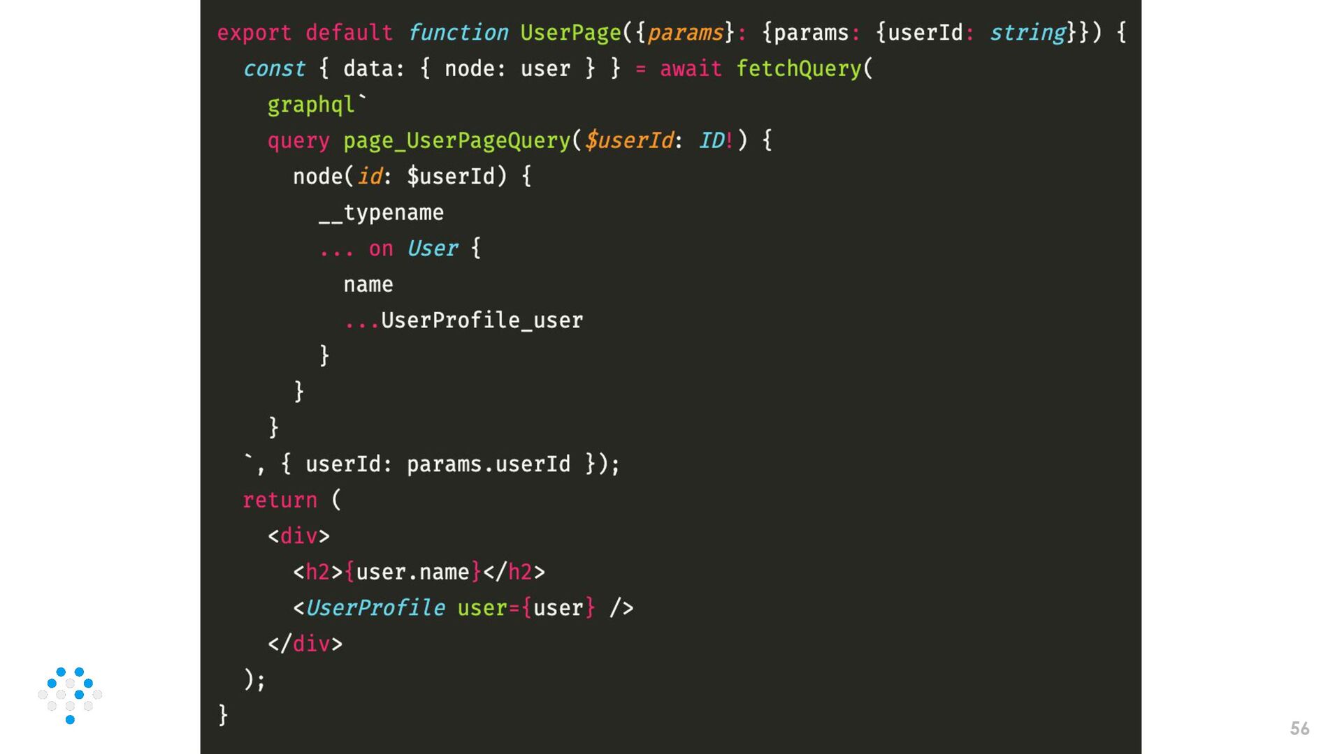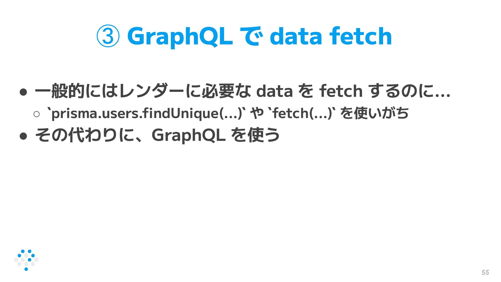 55 ③ GraphQL で data fetch • 一般的にはレンダーに必要な data を