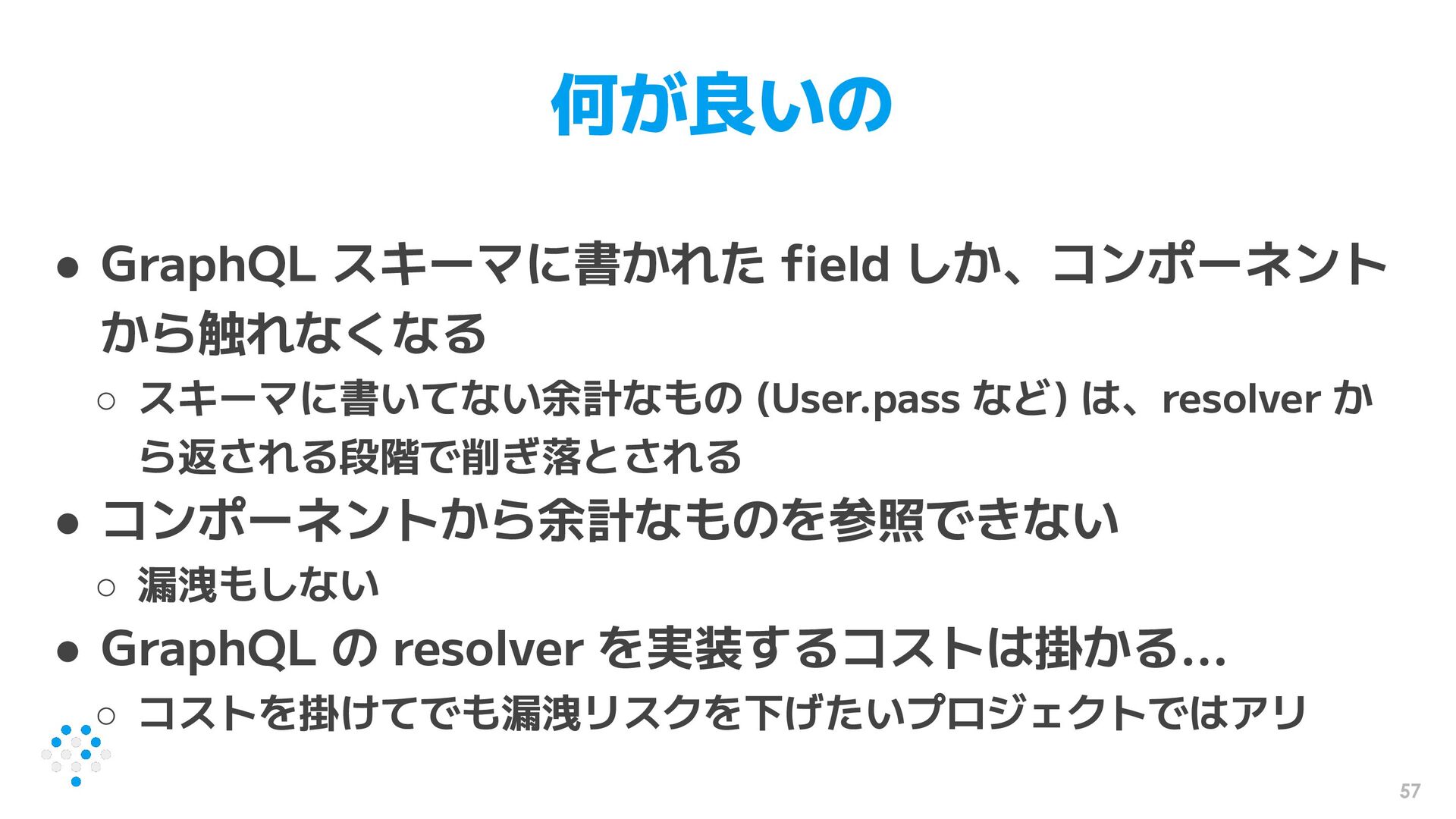 (User.pass など) は、resolver か ら返される段階で削ぎ落とされる • コンポーネントから余計なものを参照できない ◦ 漏洩もしない • GraphQL の resolver を実装するコストは掛かる... ◦ コストを掛けてでも漏洩リスクを下げたいプロジェクトではアリ