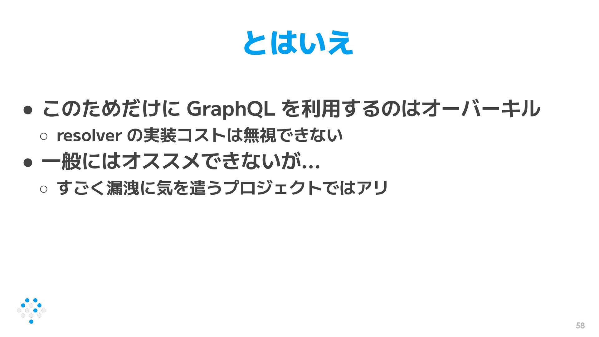 58 とはいえ • このためだけに GraphQL を利用するのはオーバーキル ◦ resolver の実装コストは無視できない •