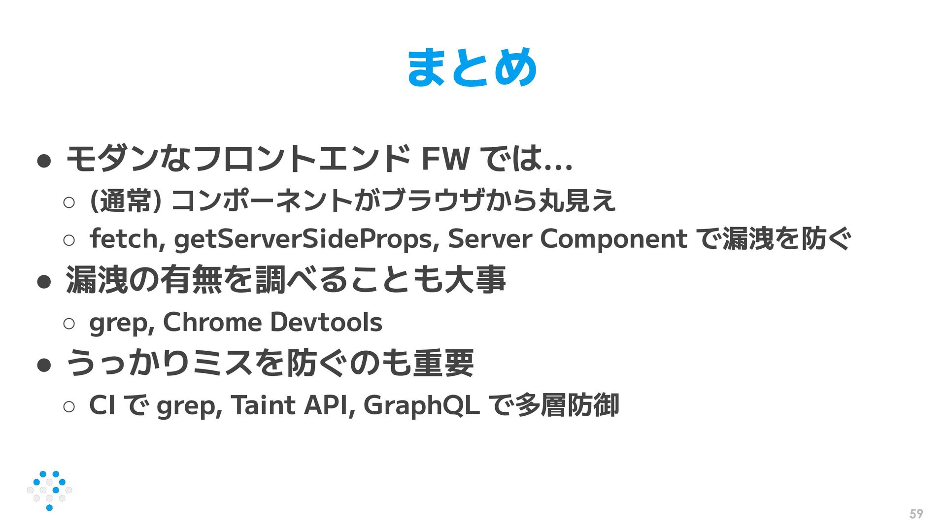 fetch, getServerSideProps, Server Component で漏洩を防ぐ • 漏洩の有無を調べることも大事 ◦ grep, Chrome Devtools • うっかりミスを防ぐのも重要 ◦ CI で grep, Taint API, GraphQL で多層防御