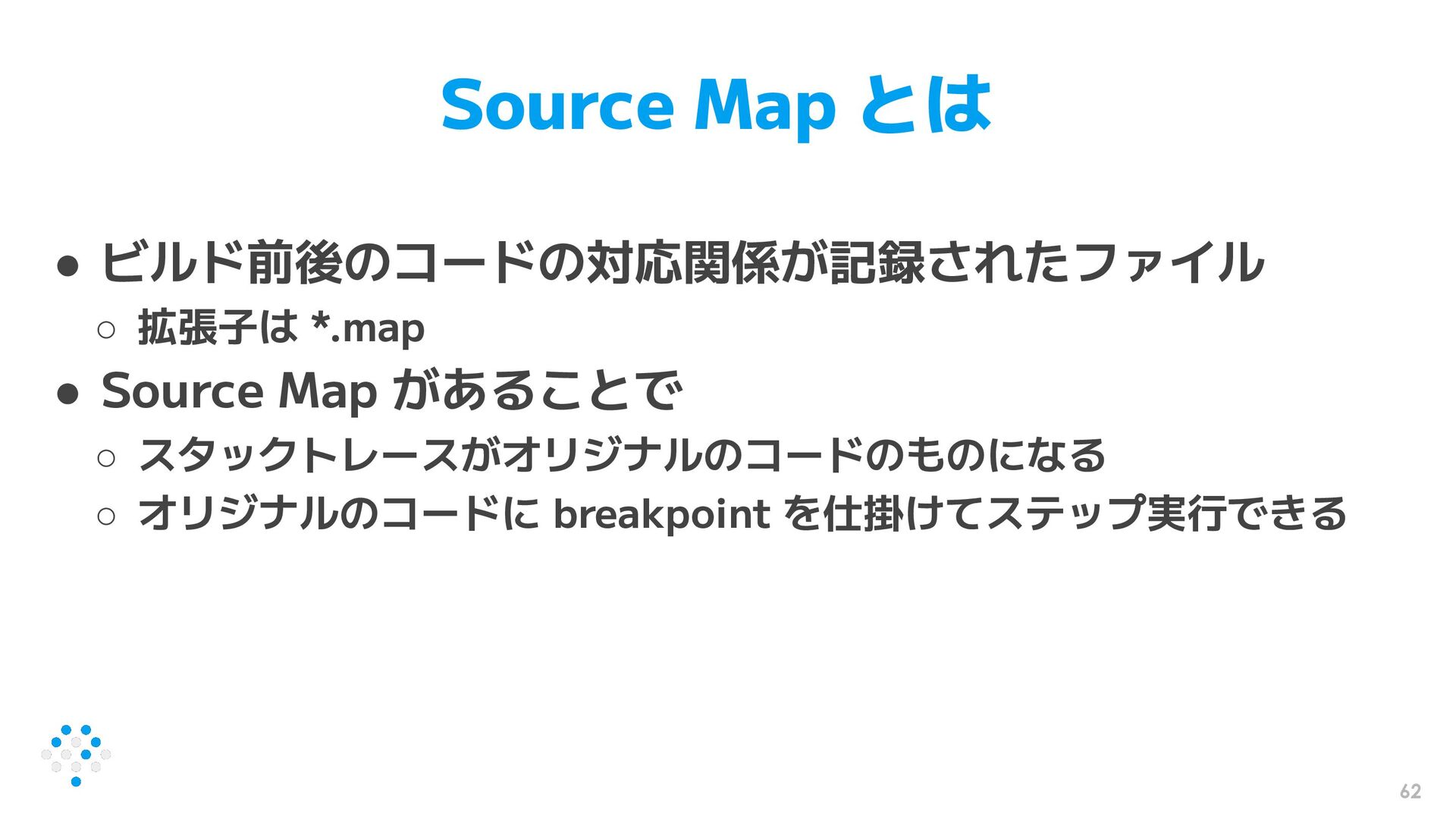 62 Source Map とは • ビルド前後のコードの対応関係が記録されたファイル ◦ 拡張子は *.map •