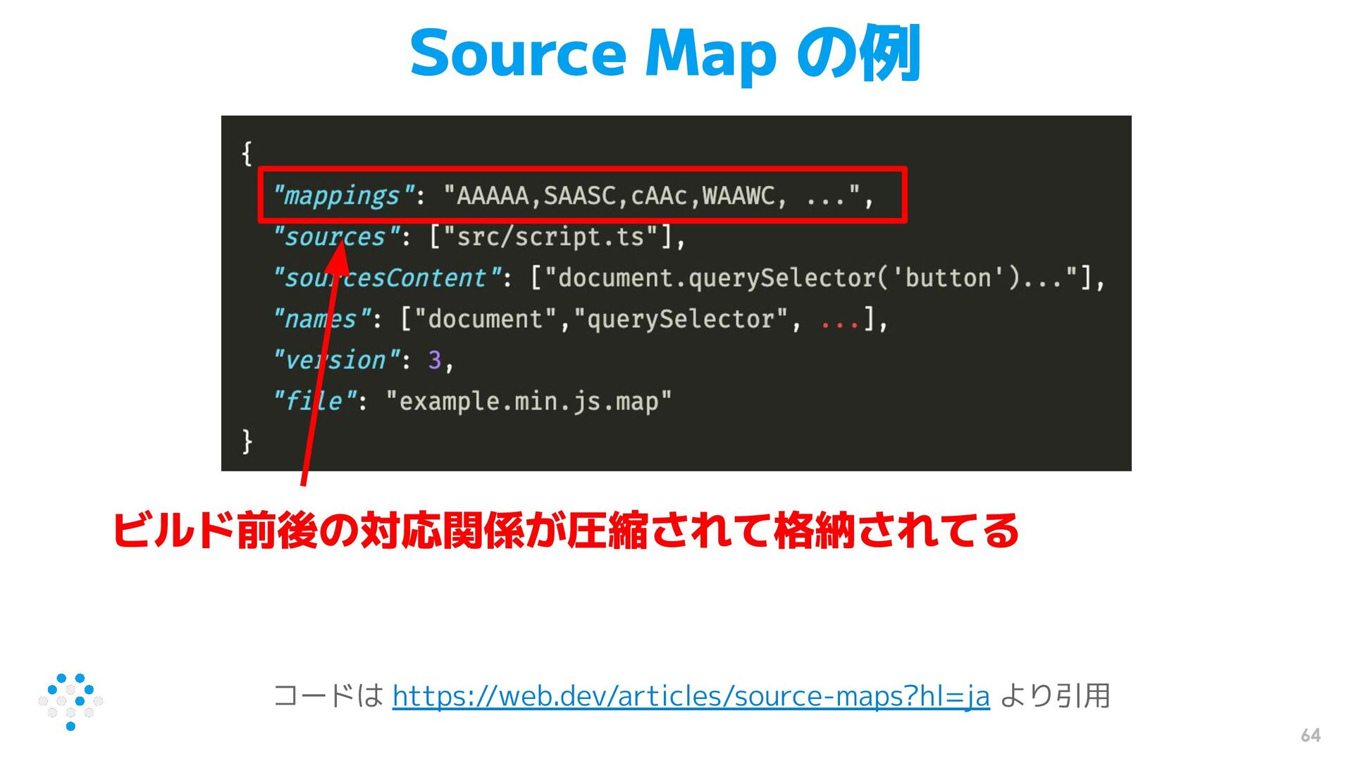 64 Source Map の例 コードは https://web.dev/articles/source-maps?hl=ja より引用 ビルド前後の対応関係が圧縮されて格納されてる