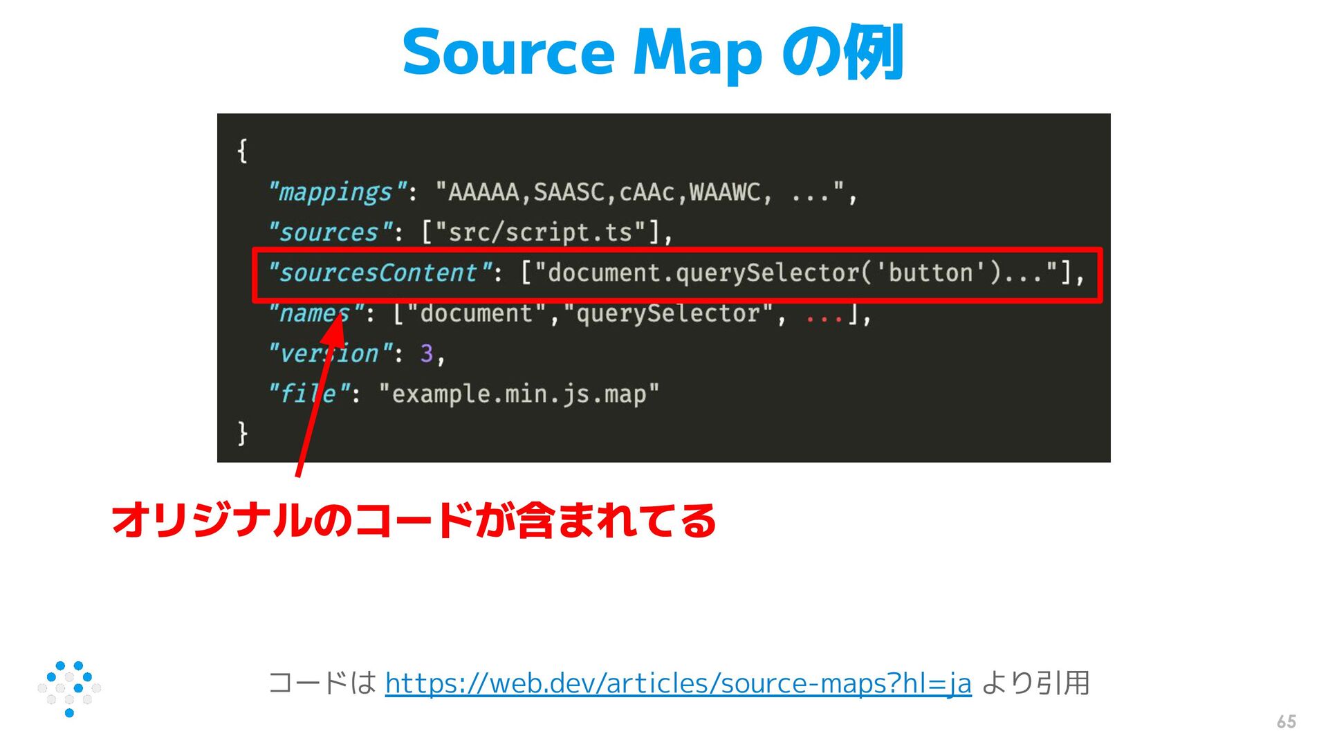 65 Source Map の例 コードは https://web.dev/articles/source-maps?hl=ja より引用 オリジナルのコードが含まれてる