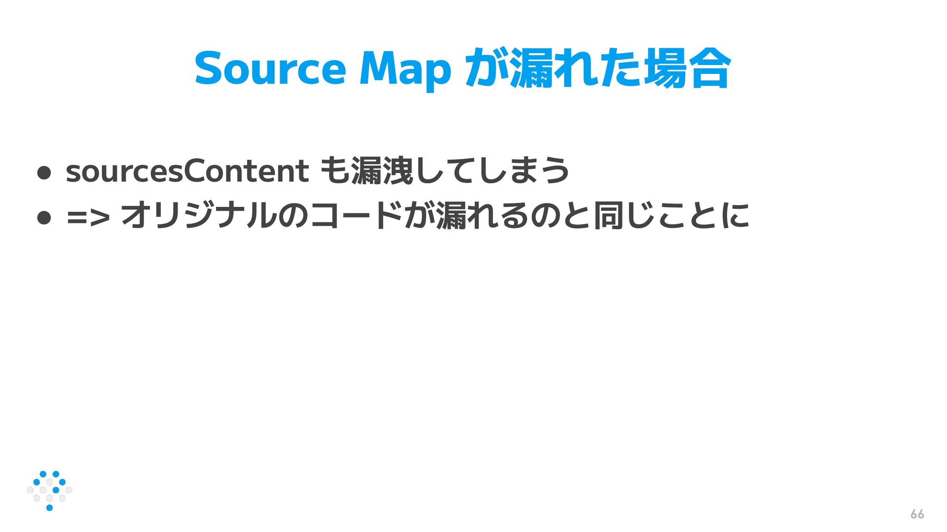 66 Source Map が漏れた場合 • sourcesContent も漏洩してしまう • => オリジナルのコードが漏れるのと同じことに
