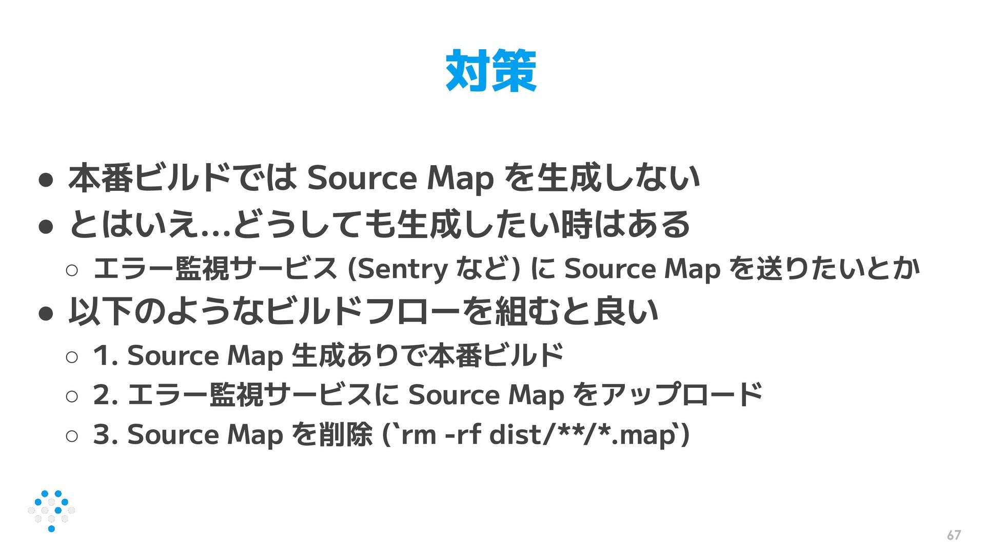 67 対策 • 本番ビルドでは Source Map を生成しない • とはいえ...どうしても生成したい時はある ◦