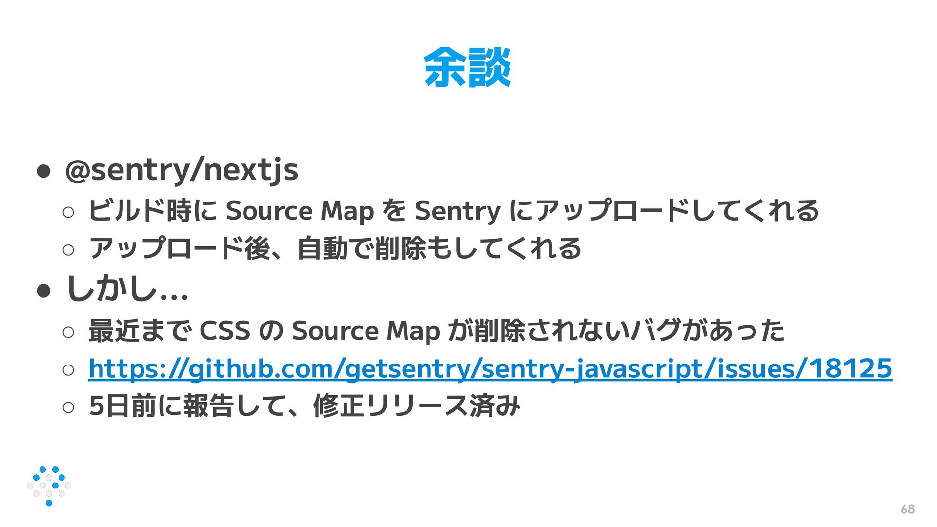 にアップロードしてくれる ◦ アップロード後、自動で削除もしてくれる • しかし... ◦ 最近まで CSS の Source Map が削除されないバグがあった ◦ https://github.com/getsentry/sentry-javascript/issues/18125 ◦ 5日前に報告して、修正リリース済み