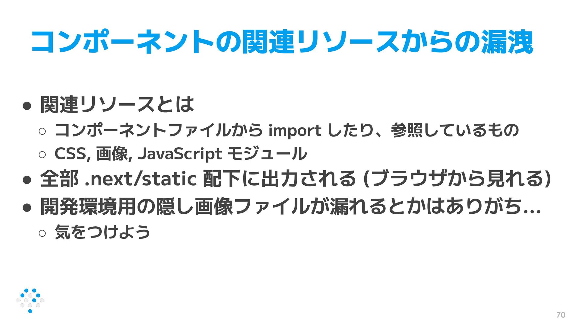 画像, JavaScript モジュール • 全部 .next/static 配下に出力される (ブラウザから見れる) • 開発環境用の隠し画像ファイルが漏れるとかはありがち... ◦ 気をつけよう