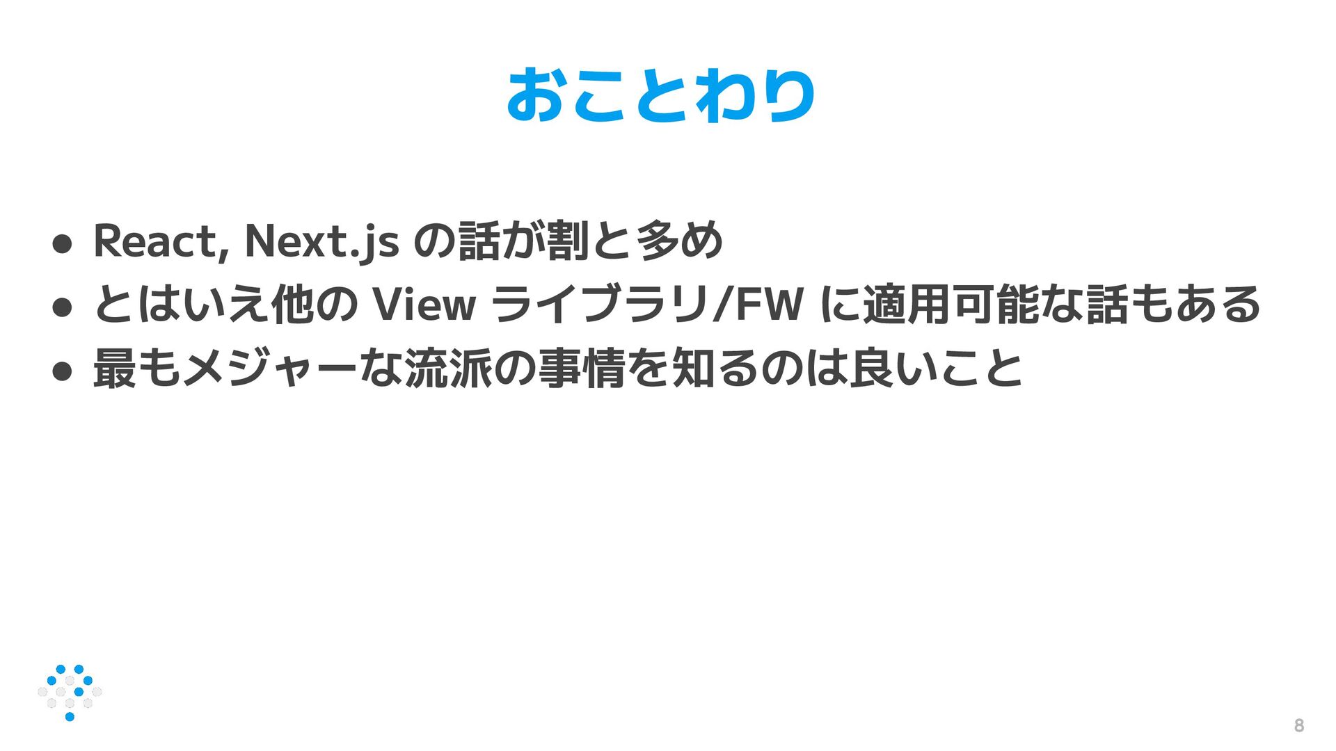 8 おことわり • React, Next.js の話が割と多め • とはいえ他の View ライブラリ/FW