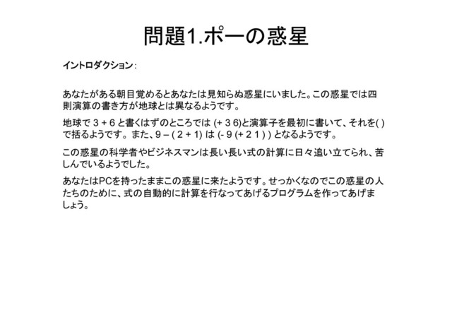[email protected] まで送付お願いします。 実行イメージ # cat input.txt (- 8 3) # cat input.txt | ruby a.rb 5 標準入力はRubyなら STDIN.gets.chomp などで拾えます。 (STDIN.getsは改行コードが 入ってしまうためchompが必要)