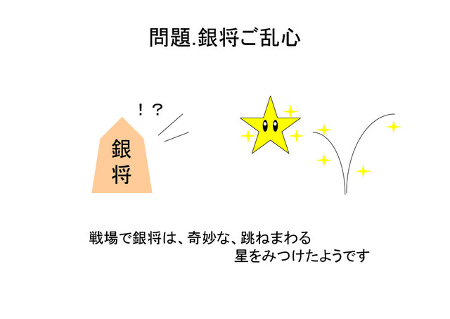 ただし銀将は完全にラ ラ ラ ラリ リ リ リっ っ っ って て て てい い い いる る る るため5方向完全ランダムに動くものとする。 銀 F F F F F F F F F F F F F F F F F 王 F F 問題: 将棋の銀将は、以下のような動きをします。 銀将(通称:銀)は飛び駒に次ぐ攻撃的な能力 をもっているため、よく敵陣への切り込み隊 長として活躍したりします。