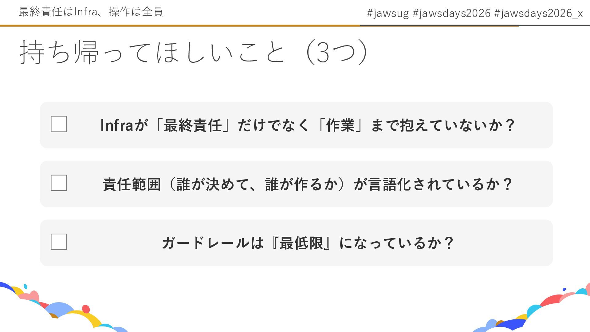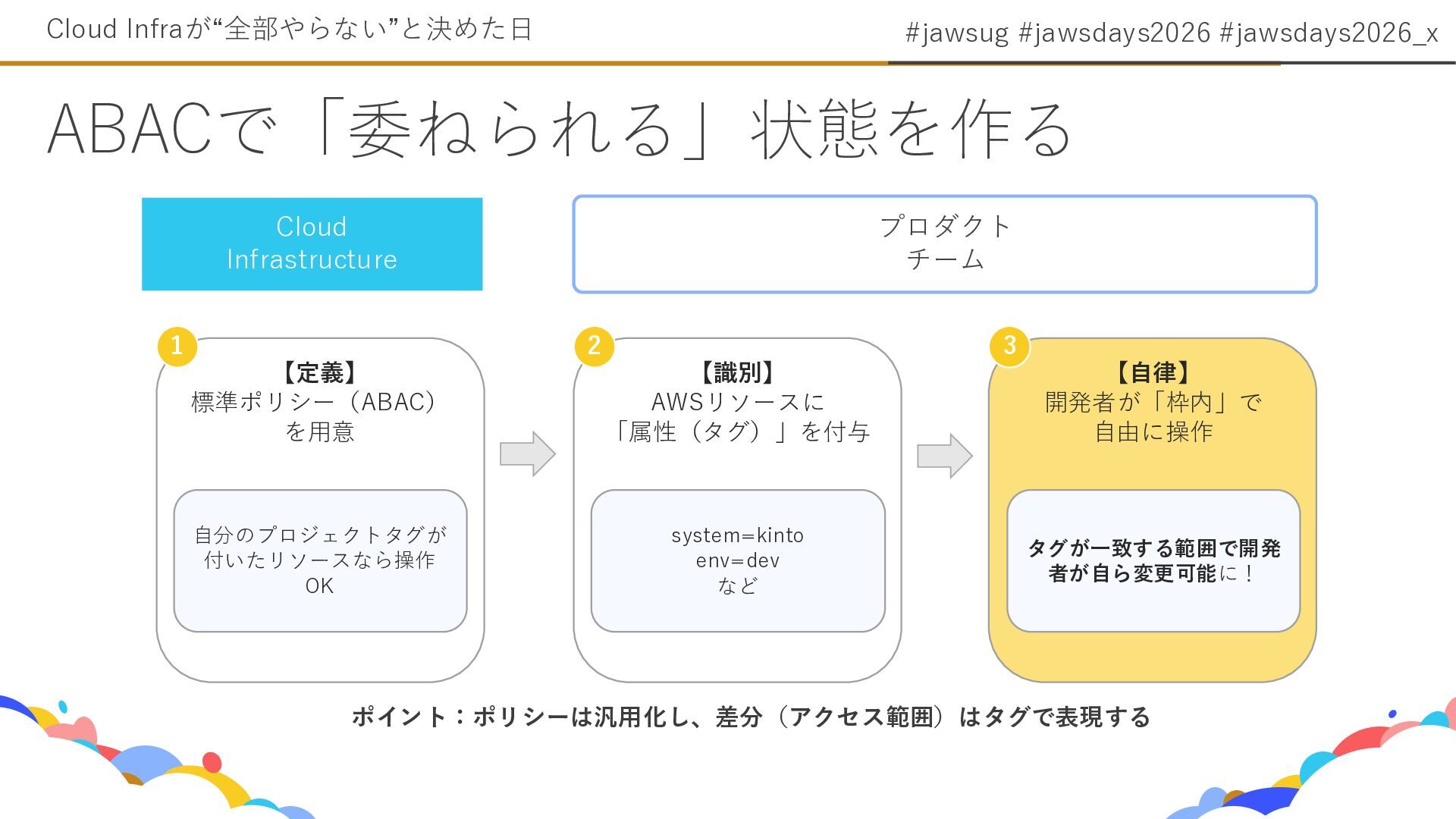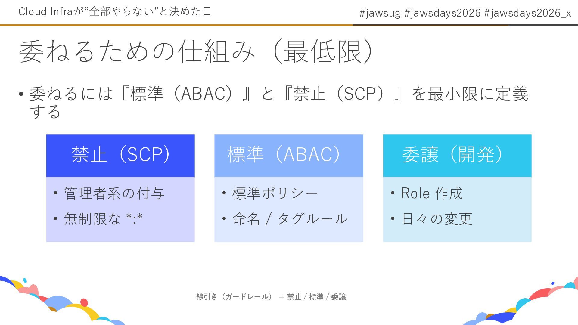 8. #jawsug #jawsdays2026 #jawsdays2026_x • 委ねるには『標準(ABAC)』と『禁止(SCP)』を最小限に定義 する 委ねるための仕組み(最低限) Cloud Infraが“全部やらない”と決めた日 線引き(ガードレール)