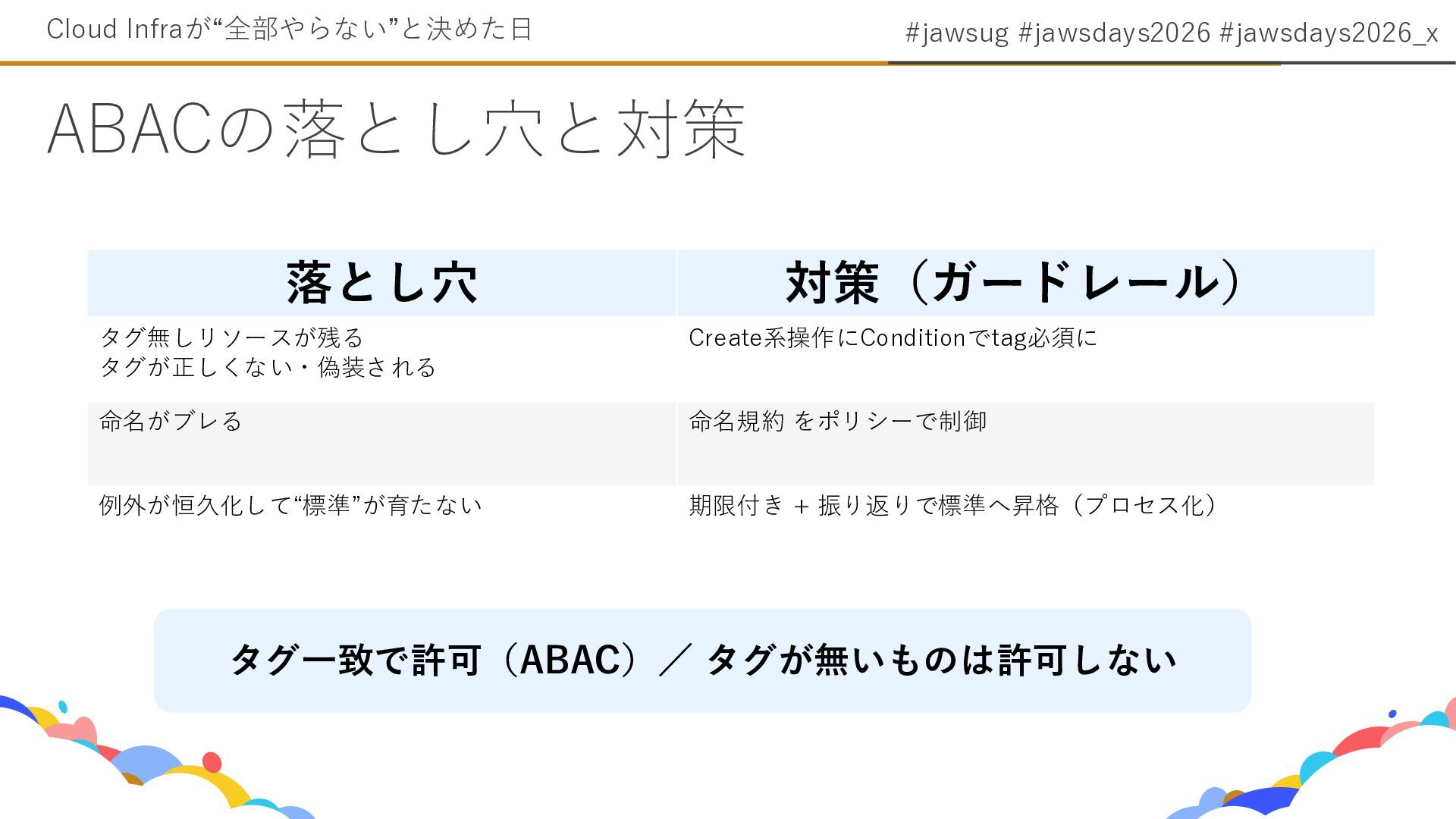 7. #jawsug #jawsdays2026 #jawsdays2026_x ABACの落とし穴と対策 Cloud Infraが“全部やらない”と決めた日 落とし穴 対策(ガードレール) タグ無しリソースが残る タグが正しくない・偽装される