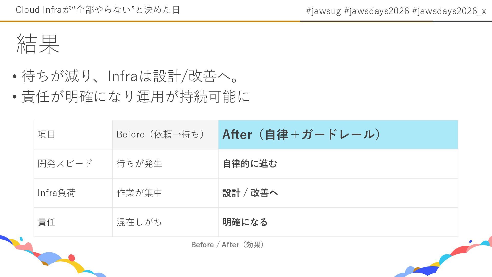 9. #jawsug #jawsdays2026 #jawsdays2026_x • 待ちが減り、Infraは設計/改善へ。 • 責任が明確になり運用が持続可能に 結果 Cloud Infraが“全部やらない”と決めた日