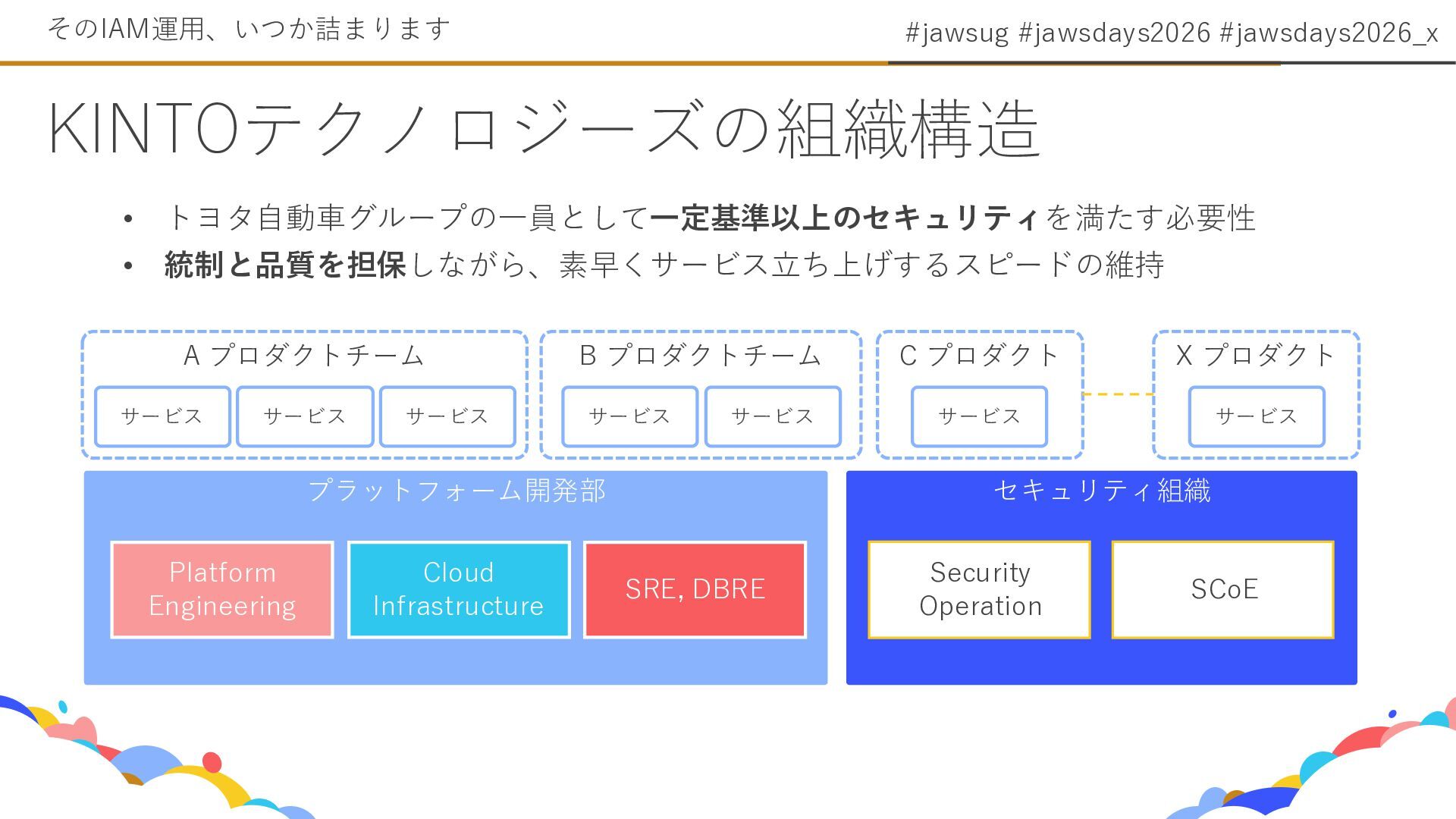 2. #jawsug #jawsdays2026 #jawsdays2026_x KINTOテクノロジーズの組織構造 そのIAM運用、いつか詰まります セキュリティ組織 プラットフォーム開発部 Cloud Infrastructure SRE,
