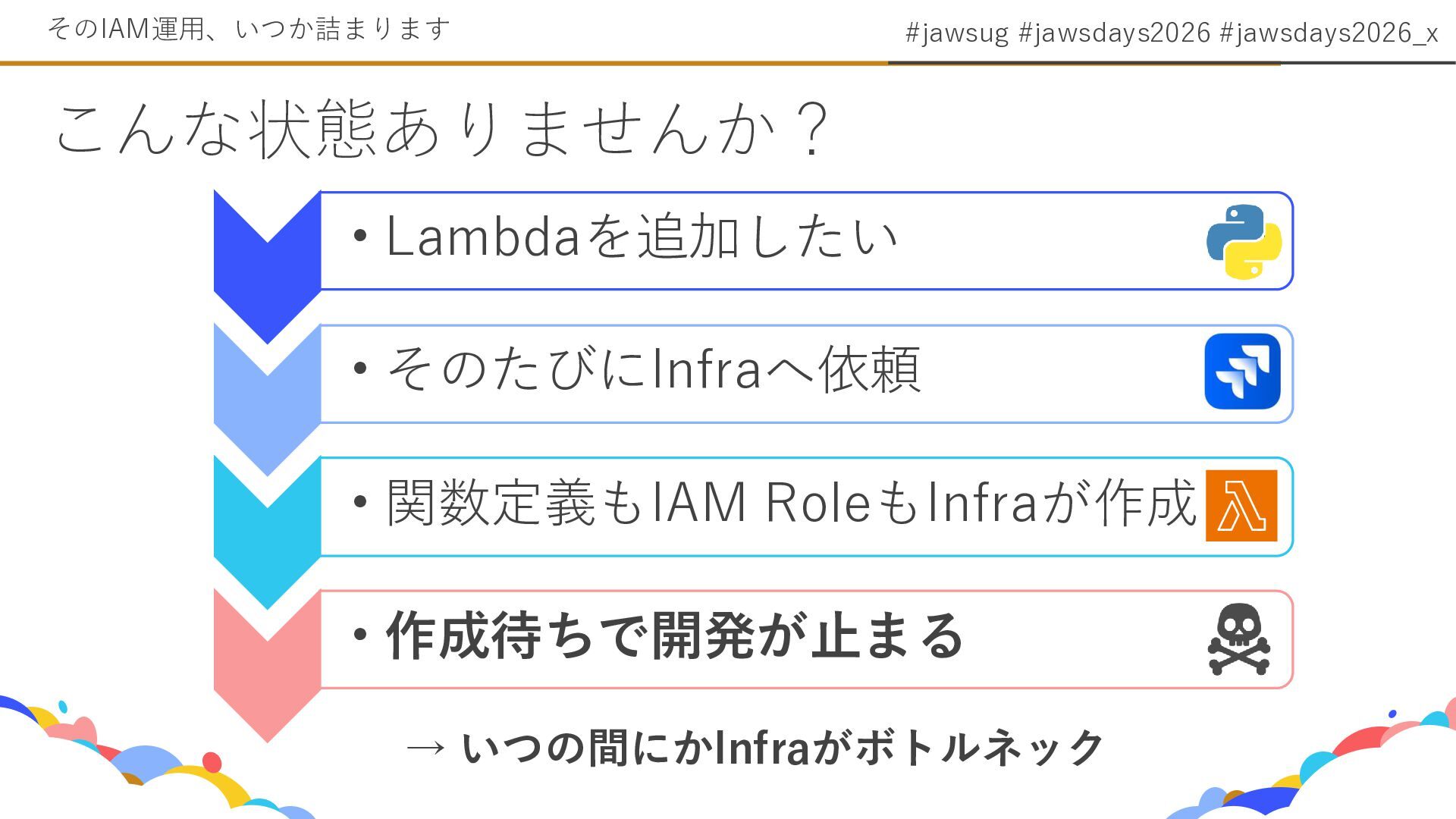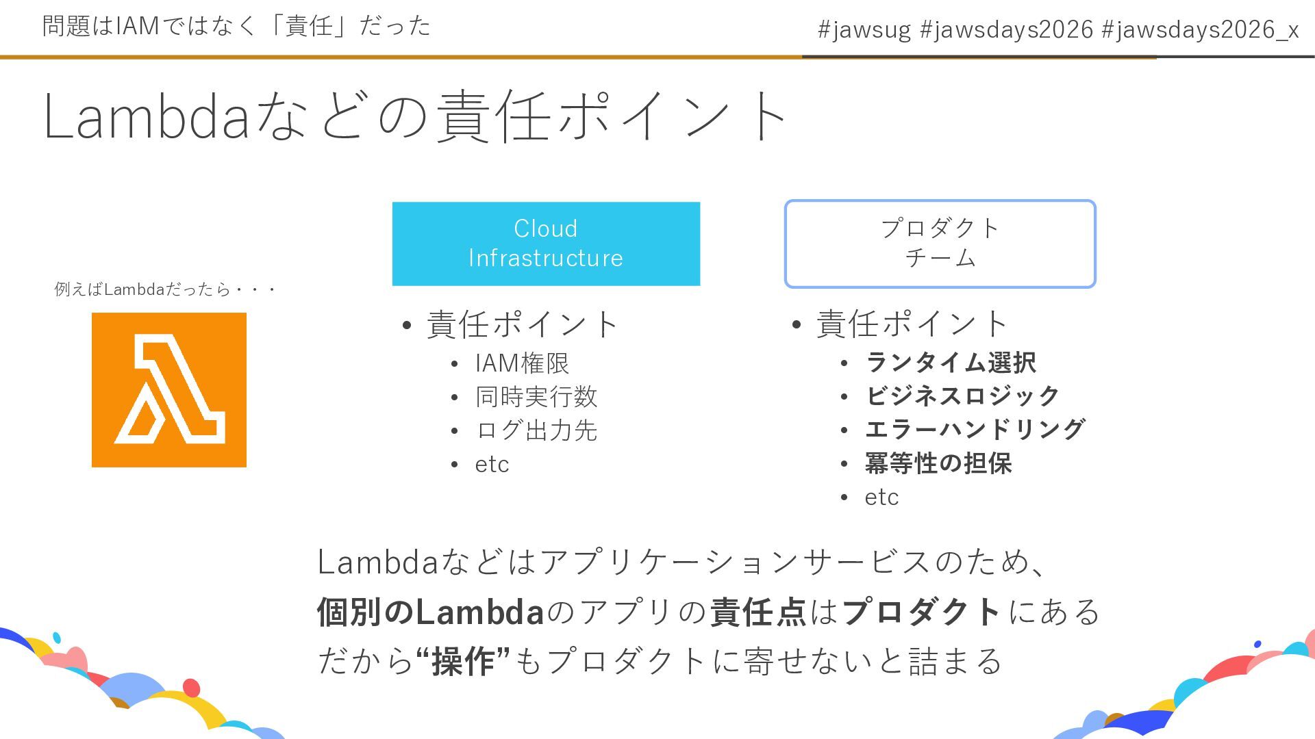 4. #jawsug #jawsdays2026 #jawsdays2026_x Lambdaなどの責任ポイント 問題はIAMではなく「責任」だった Cloud Infrastructure Lambdaなどはアプリケーションサービスのため、 個別のLambdaのアプリの責任点はプロダクトにある だから“操作”もプロダクトに寄せないと詰まる
