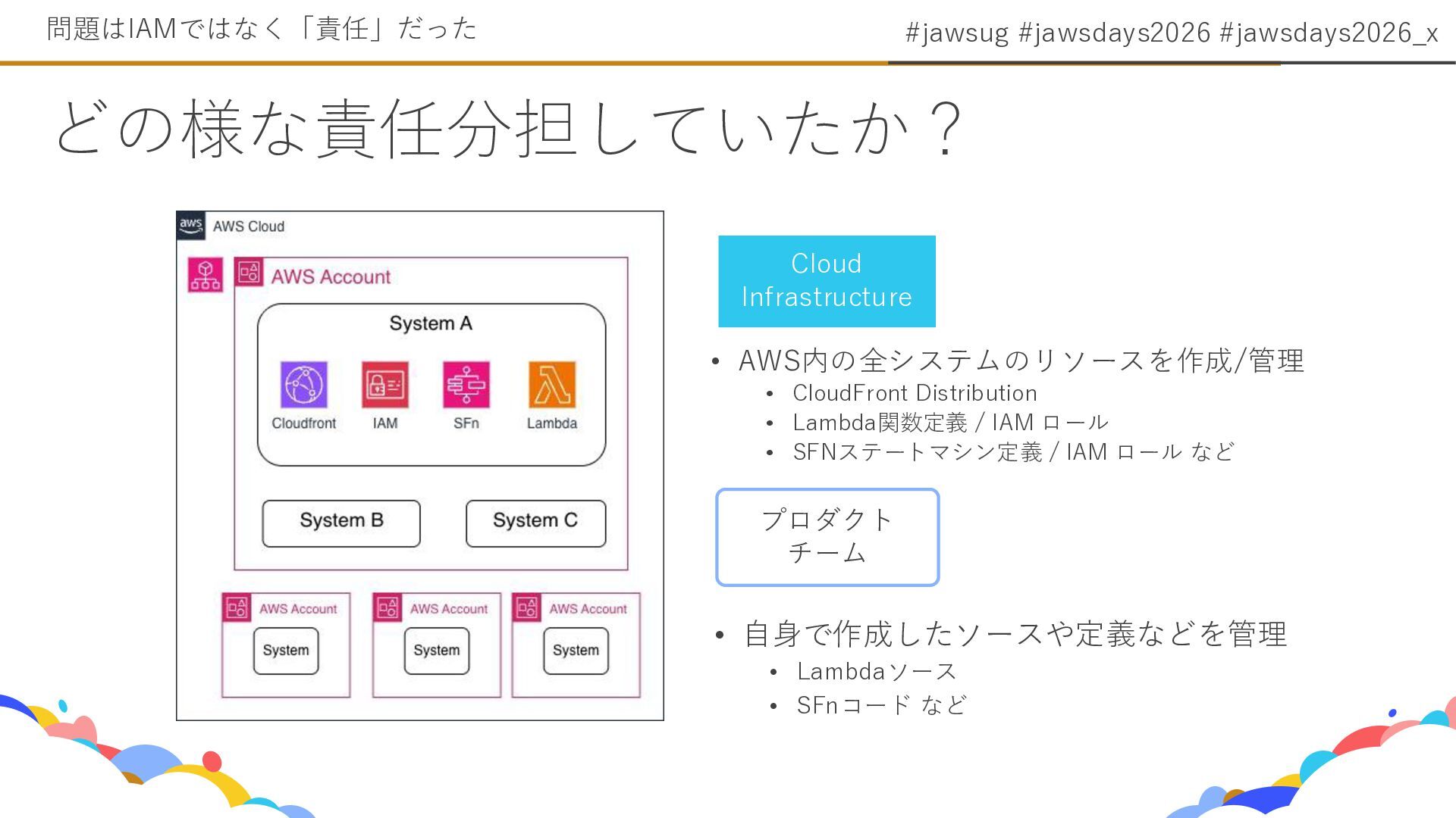 3. #jawsug #jawsdays2026 #jawsdays2026_x どの様な責任分担していたか? 問題はIAMではなく「責任」だった Cloud Infrastructure • AWS内の全システムのリソースを作成/管理 •