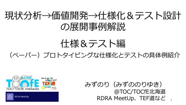 TOC(制約理論:Theory of Constraints)関連(安達さんとワークショップ作成) ・SaPIDTOC~未来予想型チーム運営ワークショップ(JaSST’18東京チュートリアル実施) ・プロジェクトマネジメントの概要とCCPMによる工期短縮の仕組み ・提案を検証する技術(TOC マフィアオファー(URO)活用技術) ・SQiP2014:CCPMの考え方を活用したテストフェーズにおける課題解決 ~課題発見、解決までのケーススタディ~ ソフトウェアテスト/テスト自動化関連 ・(共著)InSTA2019@西安:Coexistence of test execution efficiency and test ・ET⁻WEST2018:なぜ組込みシステムにおけるテストは難しいのか ~ 2つのテストアーキテクチャによってテストを組立てる ~ ・ (共著) InSTA2018@Sweden:Proposal for Enhancing UTP2 with Test Aspects ・ (共著) InSTA2017@東京:Test Conglomeration - Proposal for Test Design Notation like Class Diagram ・JaSST’17関西:納得できるテストをつくるアプローチ ・STAC2015:自動家は見た~自動化の現場の真実~ ・テストカタマリーの紹介/活用したテスト設計プロセス案