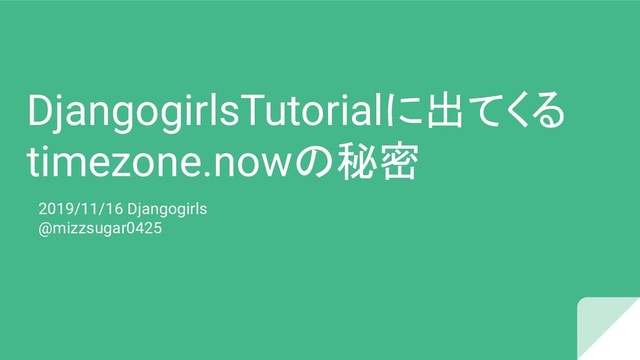 >>> from django.utils import timezone >>> >>> # nativeなdatetimeオブジェクト >>> datetime.datetime.now() datetime.datetime(2019, 11, 12, 18, 0, 39, 452139) >>> >>> # タイムゾーンがUTCであるawareなdatetimeオブジェクト >>> timezone.now() datetime.datetime(2019, 11, 12, 9, 0, 46, 708708, tzinfo=<UTC>)