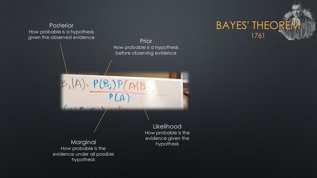 the observed evidence Prior How probable is a hypothesis before observing evidence Likelihood How probable is the evidence given the hypothesis Marginal How probable is the evidence under all possible hypothesis
